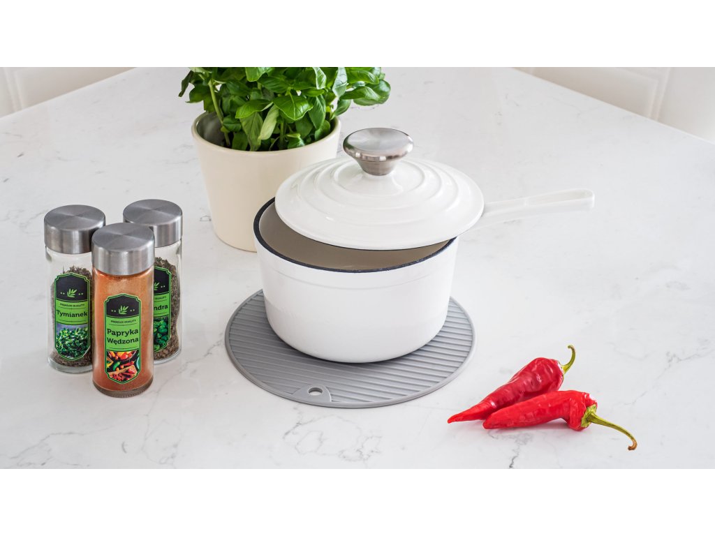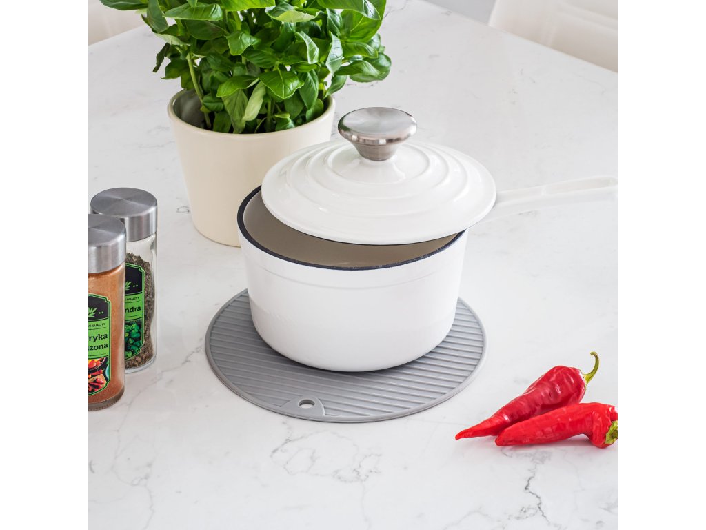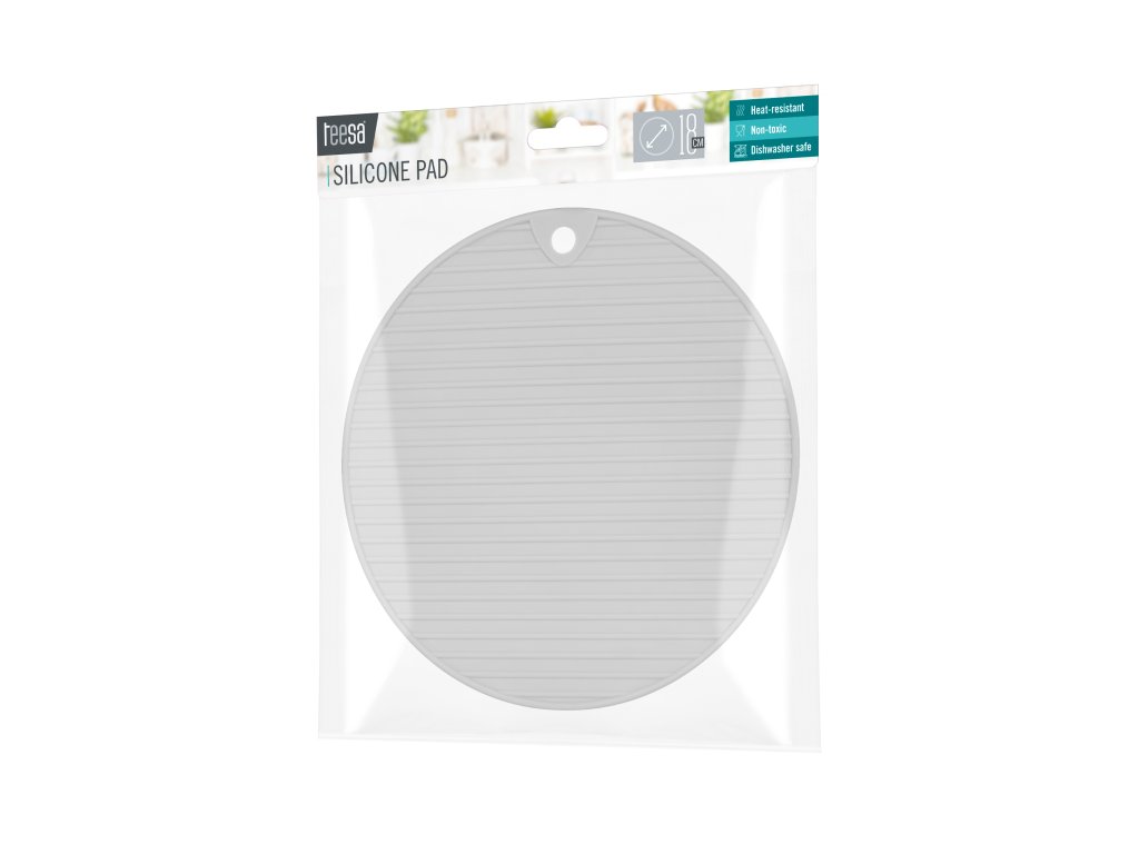 Opremljajte svoju kuhinju silikonskom podlogom za stol i zaboravite na promjenu boje uzrokovanu visokim temperaturama. Pribor od tvrtke Teesa izrađen je od visokokvalitetnih materijala i omogućuje da na njemu ostane lonac na temperaturi do 230 °C. Za povećanje sigurnosti, tanjur ima rebrastu površinu koja sprječava klizanje lonca kada je na njemu postavljen.