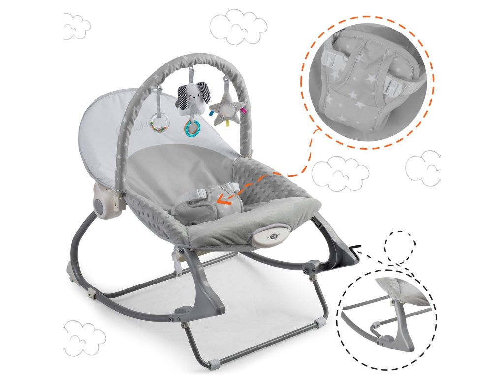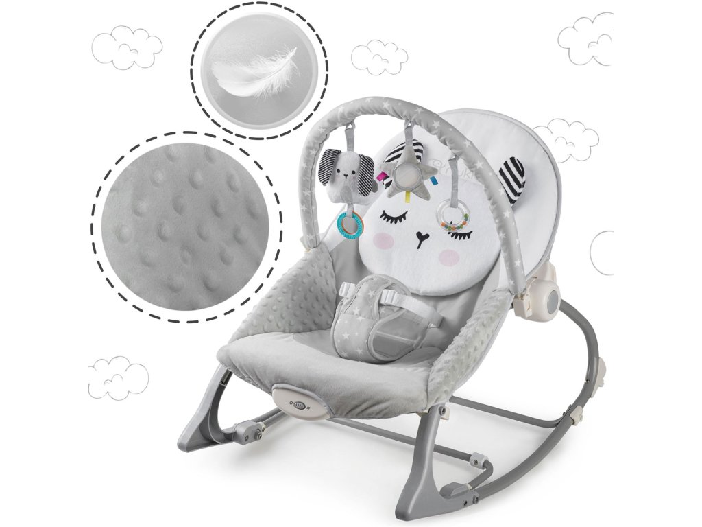 Ležaljka za bebe opremljena je uklonjivom trakom s pričvršćenim šuškavim igračkama koje će zabaviti vašu bebu dok se odmarate. Ove jedinstvene igračke stimuliraju vid i razvijaju dodir.
