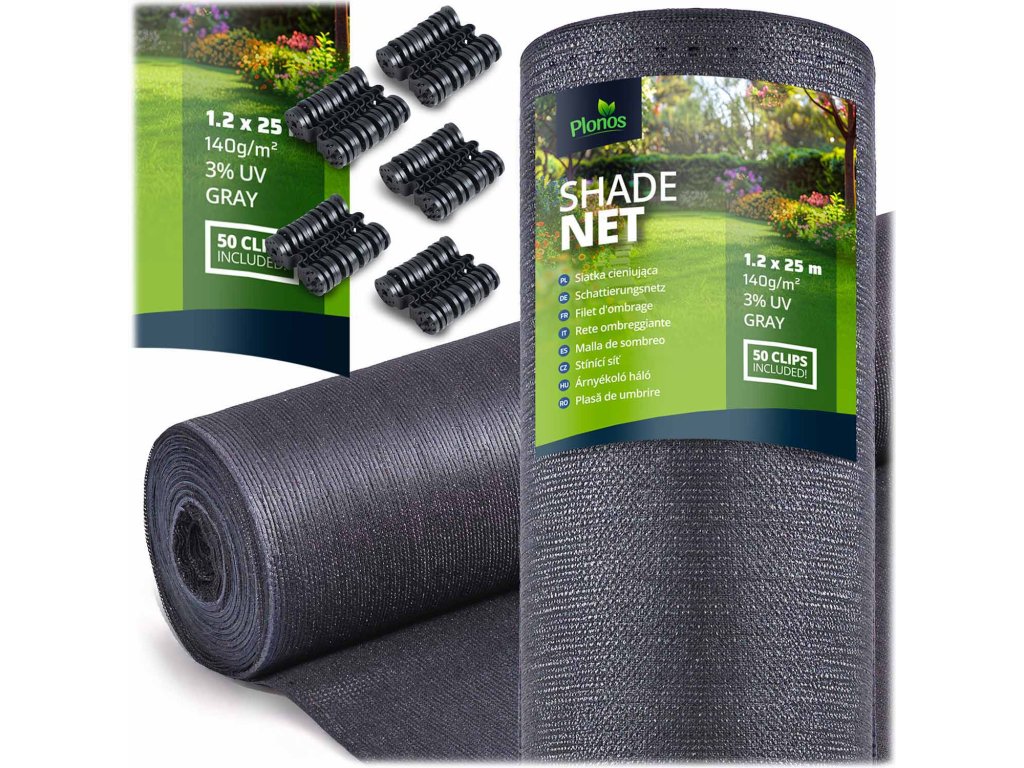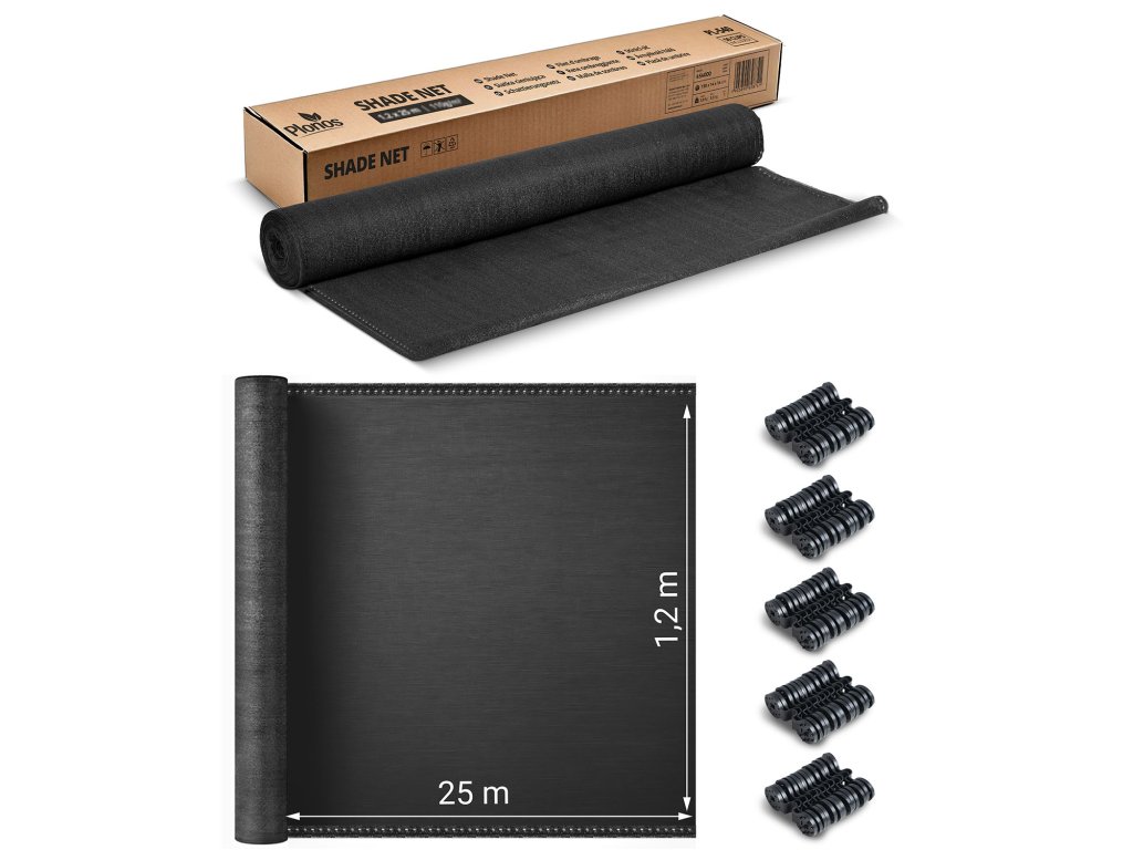 Čak 30 m? u jednoj roli 1,2x25m sjenčajuće mreže.## ## Mreža za sjenčanje 90% 25 m + 50 jakih kopči.## Gramm***ura čak 140 g/m? — osigurava optimalno sjenčanje.## Pakirano u roli — namotano, a ne presavijeno — bez nabora, jednostavna montaža.## 50 kopči u setu — pametnije rješenje od standardnog.## Otporan HDPE materijal — izdržljiv i čvrst.## 90% sjenčanja i UV zaštita.## ## Zašto odabrati mrežu od HDPE materijala ? Otporno na plijesan i gljivice — mikroorganizmi i gljive ne razvijaju se na površini.? Zaštita od sunca — blokira UV zrake.? Visoka otpornost na vremenske uvjete — ne upija vlagu, otporan na UV zračenje, mraz i kišu.## ## 90% sjenčanja — privatnost i mir u vašem vrtu!? 90% sjenčanja — učinkovita zaštita od jakog sunca, bez potpunog isključivanja svjetla.? Potpuna privatnost — kraj znatiželjnim pogledima susjeda i prolaznika.? Udobnost za životinje — smanjenje vizualnih podražaja donosi više mira vašem ljubimcu.? Veći komfor relaksacije — stvorite svoju zelenu oazu mira i opuštajte se bez osjećaja da vas netko promatra.## ## Brza i jednostavna montaža zahvaljujući profesionalnim kopčama!Profe****sionalne kopče u setu (50 komada) znatno olakšavaju montažu mreže. Pomoću njih brzo i stabilno pričvrstite zaštitu na ogradu, bez potrebe za dodatnim alatima.## Zahvaljujući pravilno završavanju rubova, s lakoćom dodatno pričvrstite mrežu pomoću vezica (nisu u setu).## ## Specifikacija:## dimenzije: 1,2 x 25 m,## grammatura: 140 g/m?,## materijal: HDPE UV 3%,## kopče za pričvršćivanje: 50 komada.## ## Primjeri primjene:? Zaštita posjeda, vrtova, balkona i terasa.? Zaštita biljaka, cvjetnih gredica i povrtnjaka od vjetra i prekomjernog sunca.? Estetsko pokrivanje kanti za smeće, kompostera i drugih manje atraktivnih mjesta.? Zaštita i ograđivanje gradilišta.? Osiguranje sportskih objekata.? Zaštita i pokrivanje parkirnih mjesta.Additional parameters