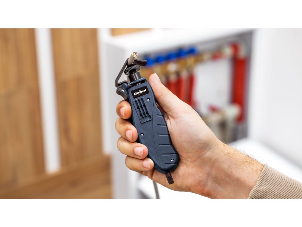 Korištenje noža za skidač izolacije Rebel Tools je vrlo jednostavno. Uređaj ima podesivo produženje držača kabela, tako da je dovoljno ubaciti kabel, postaviti držač u željeni položaj i zatim zategnuti nož za skidanje izolacije. Sada je dovoljno samo zakrenuti nož da prerežete izolaciju i odlučnim pokretom izvući žicu.