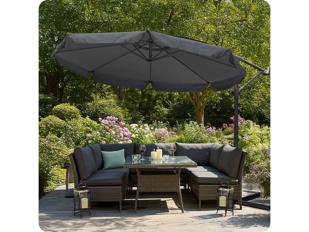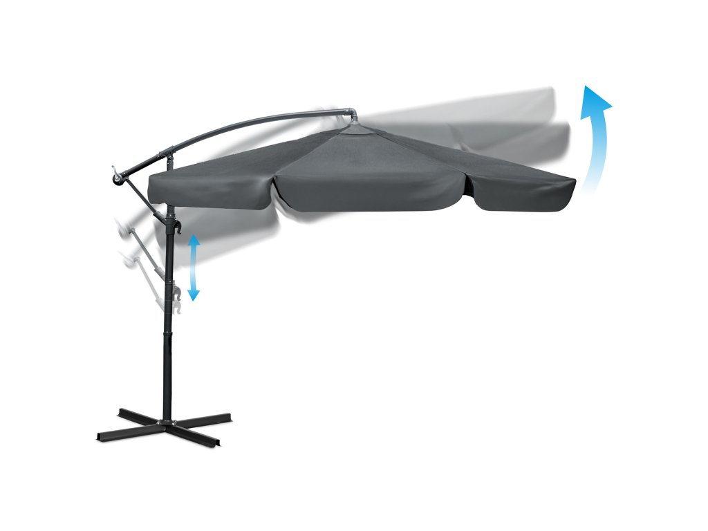 - Mogućnost bilo kakvog podešavanja suncobrana: visina + kut nagiba. U sklopljenom stanju zauzima malo prostora.