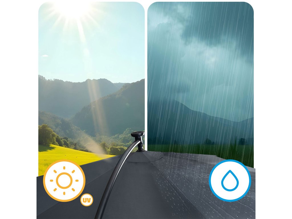 - Kiša Nema šanse! Zahvaljujući vodootpornom materijalu PE naš suncobran učinkovito štiti od svake kapi.