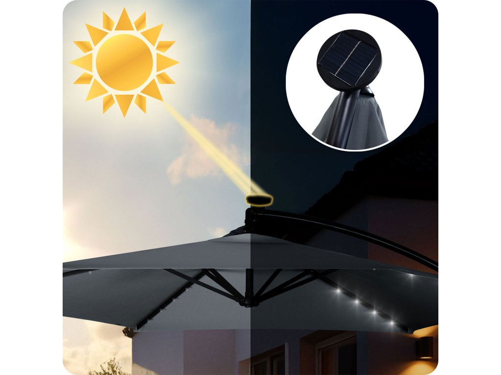 UV panel na suncobranu s LED svjetlima omogućuje provesti cijelu noć u ugodnom sjaju zahvaljujući energetski učinkovitom napajanju solarnog panela dimenzija 80 x 80 mm.