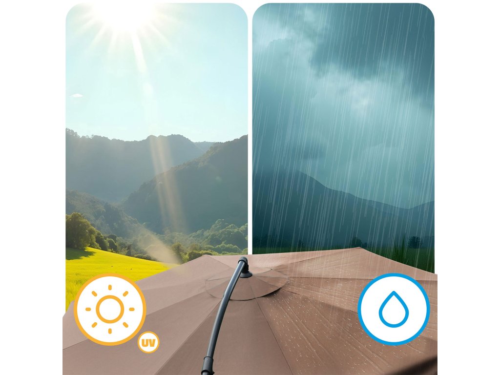 - Kiša Nema šanse! Zahvaljujući vodootpornom materijalu PE naš suncobran učinkovito štiti od svake kapi.
