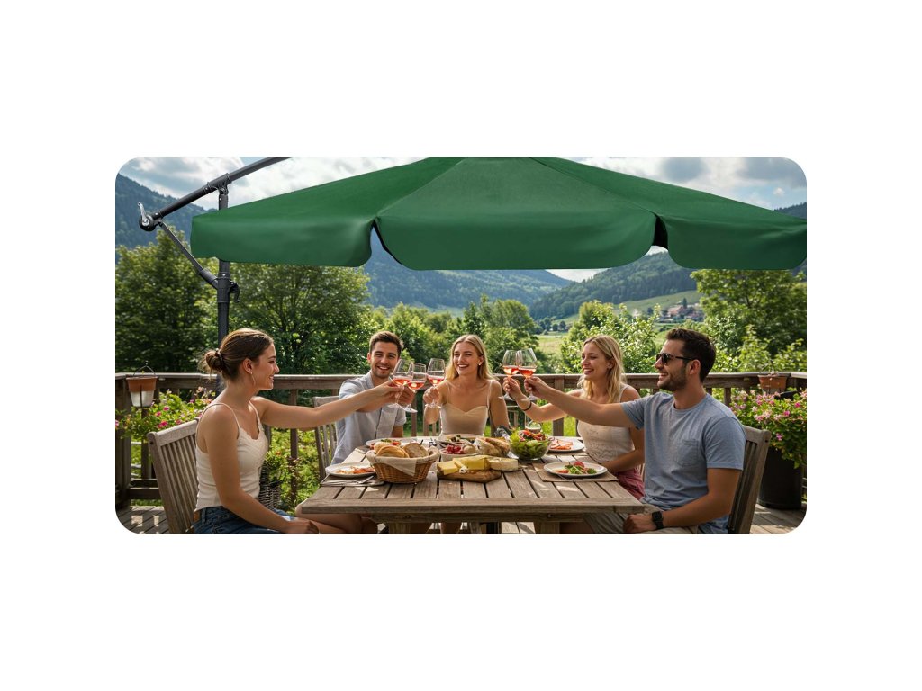 Navlaka od izdržljivog materijala Oxford izvrsno štiti suncobran od štetnog djelovanja UV zračenja i drugih atmosferskih utjecaja, sprječava blijeđenje materijala i produžuje njegov vijek trajanja.