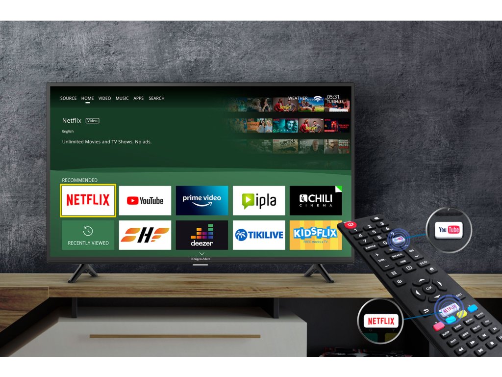 Pametni TV Kruger&Matz opremljen je velikim brojem priključaka koji omogućuju povezivanje dodatnih uređaja na bilo koji način, pretvarajući ga u multimedijalnu zabavnu platformu. Gledajte filmove, spojite igraću konzolu ili kućno kino i uživajte u televizoru punom snagom.