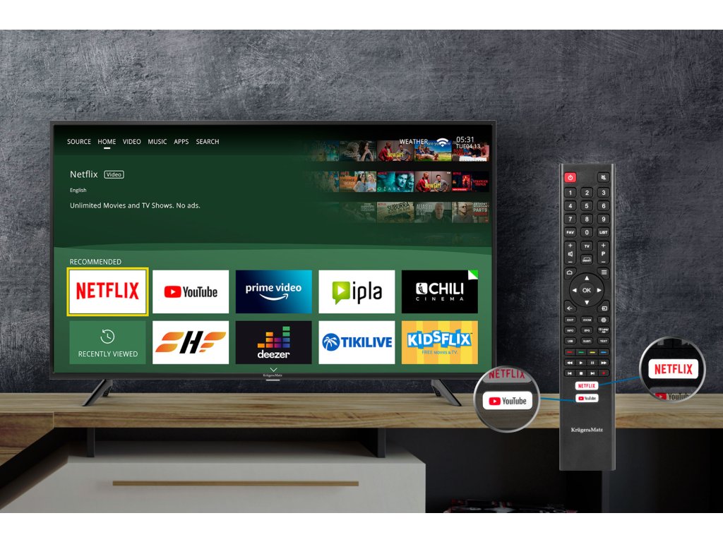 Smart TV Kruger&Matz opremljen je s mnogo priključaka, zahvaljujući kojima možete na bilo koji način povezati dodatne uređaje i pretvoriti ga u multimedijalnu platformu za zabavu. Gledajte filmove, spojite igraću konzolu ili kućno kino i iskoristite televizor u potpunosti.