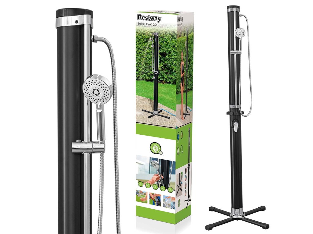 Osim toga, spremnik za vodu ima kapacitet do 20 litara vode, koje se zahvaljujući boji i konstrukciji tuša mogu zagrijati sunčevim zrakama.