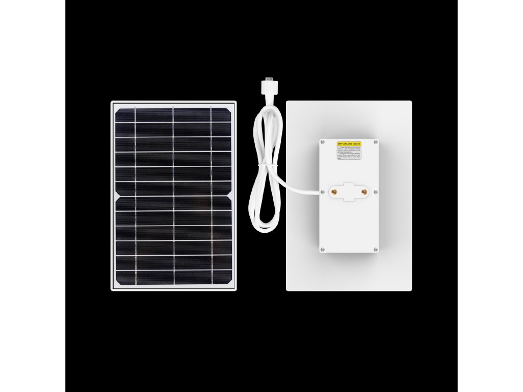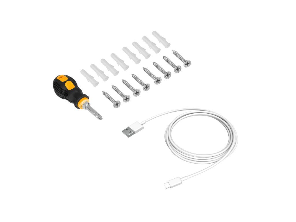 Sadržaj pakiranja: kamera, solarni panel, držač solarnog panela, odvijač, vijci, čepovi