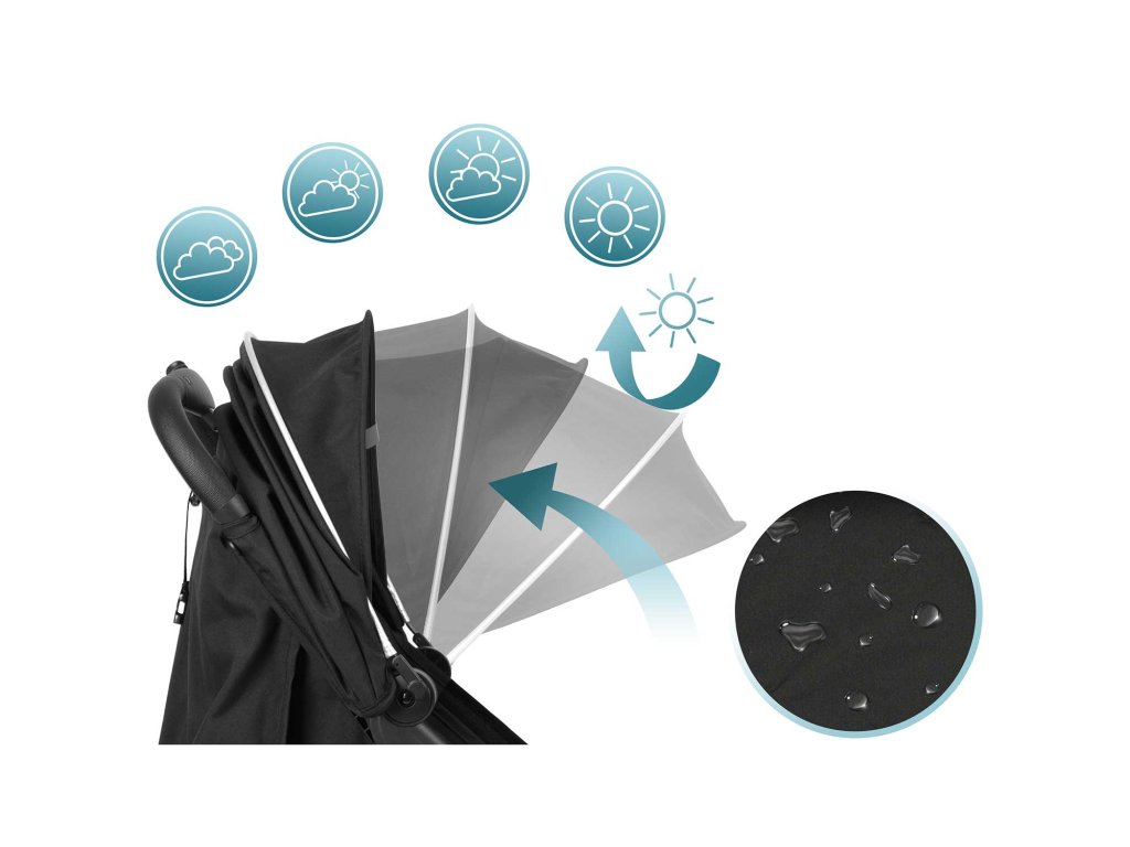 Omogućuje zaštitu djeteta od izravnog sunčevog svjetla, vjetra ili blage kiše.