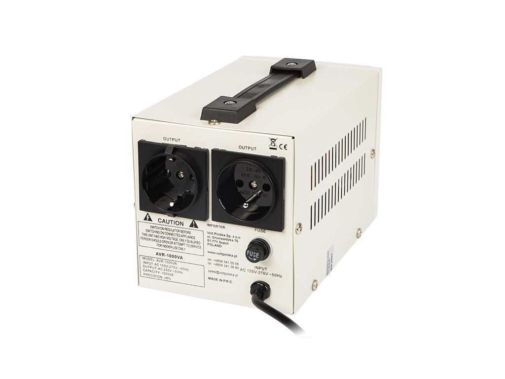 Stabilizator mrežnog napona AVR 1000 kombinira funkcije 2 uređaja: regulatora napona i prenaponske zaštite. Glavna funkcija je automatska regulacija napona isporučenog na ulaz stabilizatora. Uređaj poboljšava parametre napona isporučenog, npr. iz lokalne mreže ili generatora struje. Također potiskuje smetnje koje u električnu mrežu unose drugi uređaji. Specifikacija: - Snaga: 1000V- Raspon ulaznog napona: 150-270V- Ulazna frekvencija: 50Hz- Izlazni napon: 230V- Točnost izlaza:8%- Vrijeme kašnjenja: 180s/6s- Zaštita: Preopterećenje, prenapon, prenaponska zaštita, temperatura, kratki spoj- Dimenzije: 34x25x22cm- Težina: ##12kg##.Dodatni parametri