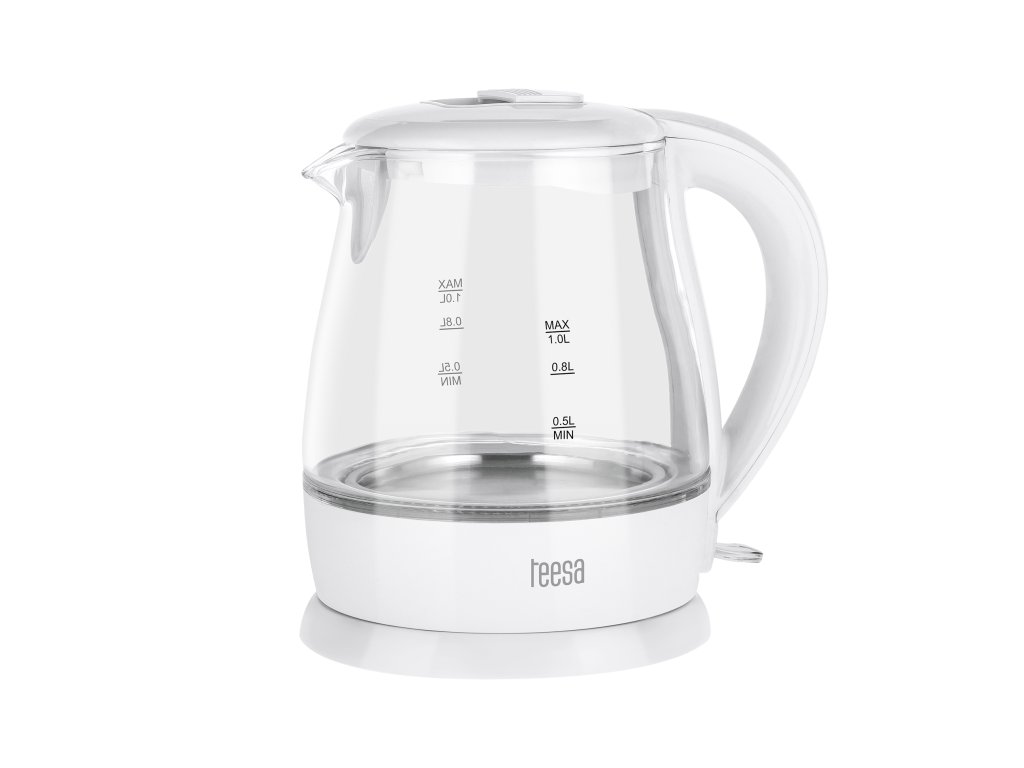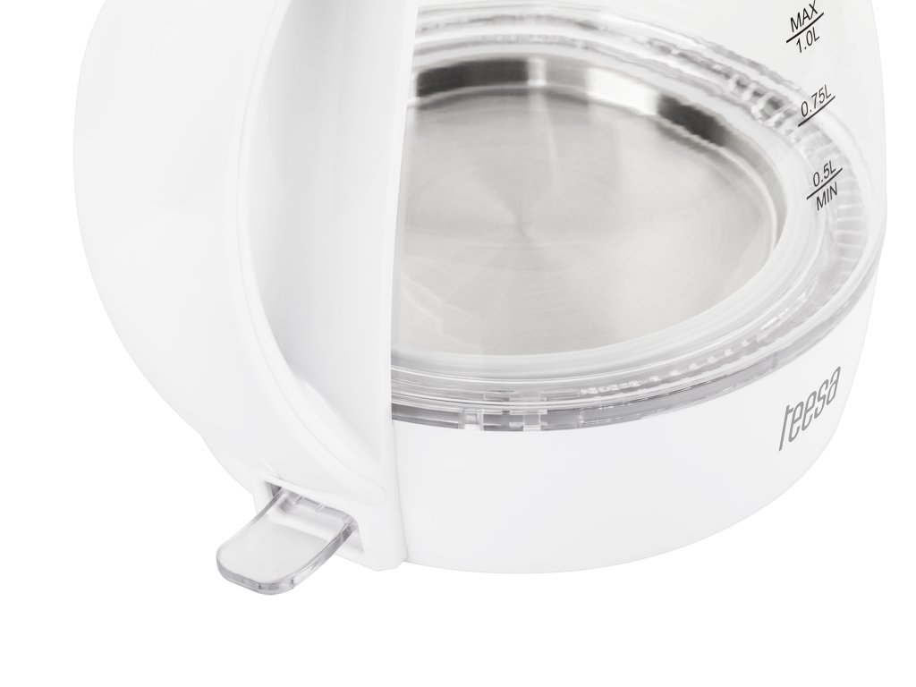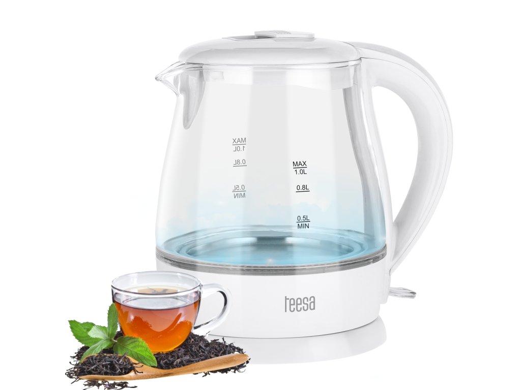 Električno kuhalo za vodu Teesa ističe se uporabom izdržljivog borosilikatnog stakla otpornog na nečistoće, koje je dopunjeno komponentama od visokokvalitetne plastike. Zahvaljujući maksimalnoj snazi od 2200 W i ravnom grijaču, voda brzo zavrije.