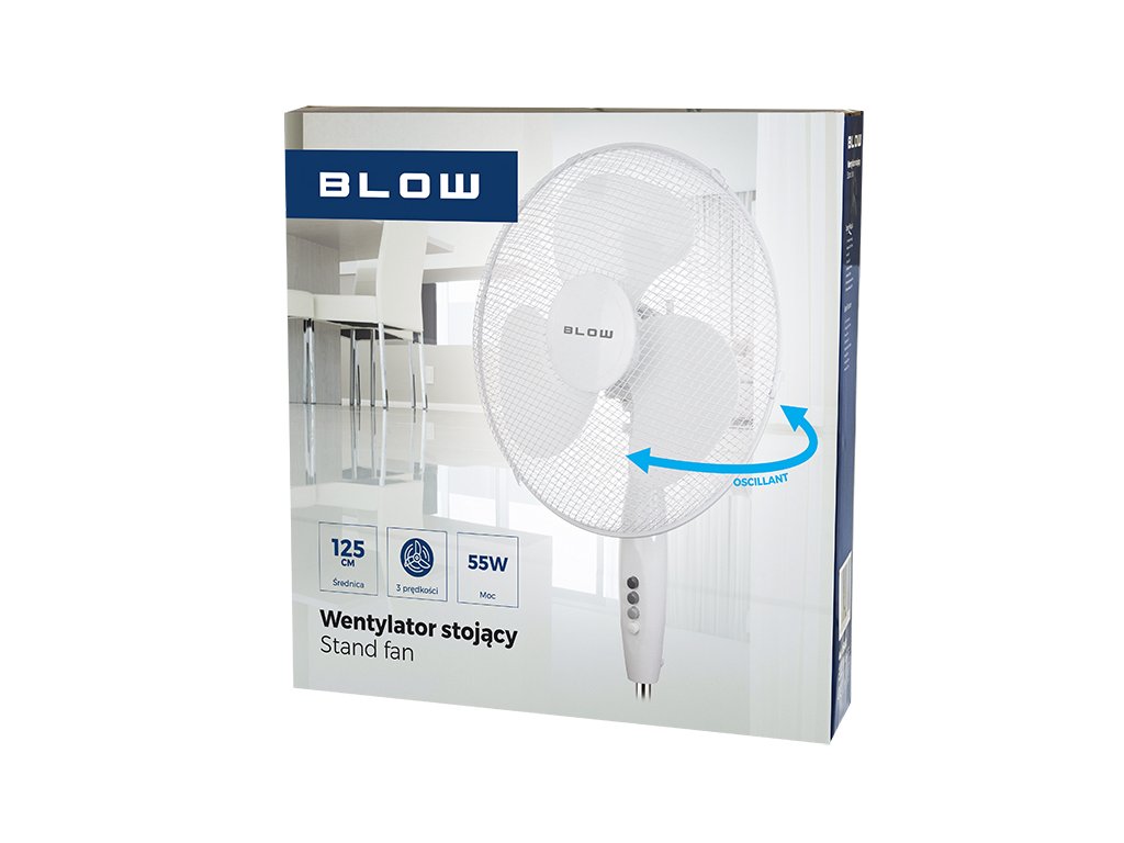Snažan i tihi ventilator BLOW je moderan uređaj zahvaljujući kojem možete zaboraviti neugodne vrućine. Ventilator ima čak 3 razine rada i funkciju oscilacije koje osiguravaju cirkulaciju zraka u cijeloj prostoriji. Korištenje guste mreže osigurava sigurnost naše djece jer zahvaljujući njoj neće odlagati kocke ili druge predmete koji bi mogli ugroziti njihovo zdravlje. Konstrukcija ventilatora zadovoljava potrebe korisnika i omogućuje podešavanje ne samo visine na kojoj će biti postavljen već i kuta nagiba ventilatora.Specifikacija: