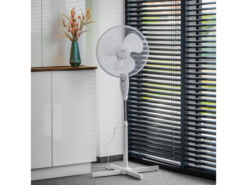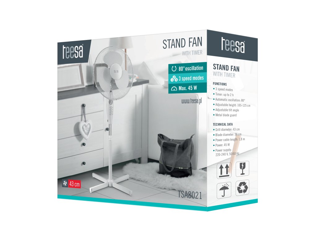 NALJET SVJEŽEG ZRAKA! Sve zahvaljujući samostojećem ventilatoru Teesa! Odabir između tri brzinska načina omogućuje vam prilagođavanje temperature vašim potrebama. Veliki promjer krila pokretan motorom s nazivnom snagom od 45 W, u kombinaciji s automatskom 80° oscilacijom, znači da ventilator može bez problema rashladiti veću prostoriju.Ventilator je opremljen funkcijom timera, što znači da možete postaviti vrijeme njegovog automatskog isključivanja. Prednosti uređaja svakako uključuju i podesivu visinu i mogućnost promjene kuta nagiba. Ventilator Teesa također znači sigurnost zahvaljujući metalnom pokrovu koji okružuje krila uređaja. Isprobajte ga još danas i osjetite svjež povjetarac tijekom vrućih dana!