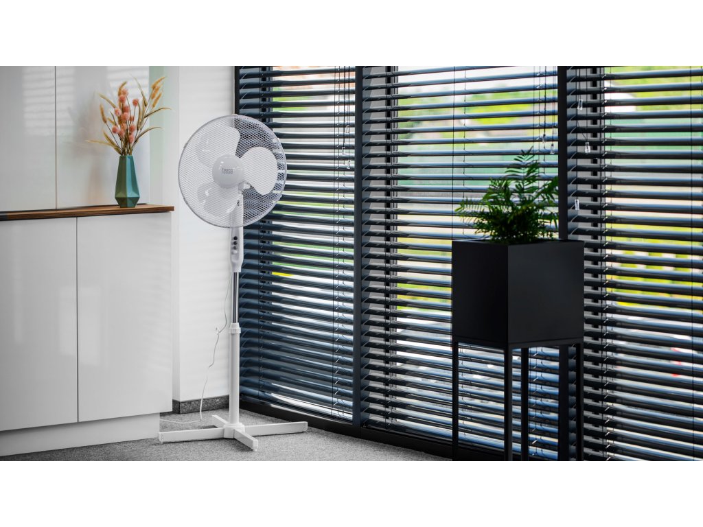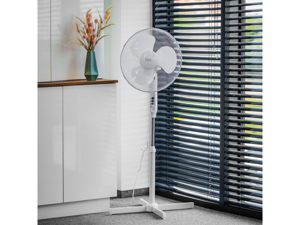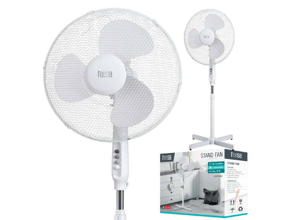 DAŠAK SVJEŽEG ZRAKA! Sve to zahvaljujući stojećem ventilatoru Teesa! Izbor od tri brzinska režima omogućuje vam prilagodbu temperature vašim potrebama. Veliki promjer lopatica pogonjenih motorom s nazivnom snagom od 45 W u kombinaciji s automatskom oscilacijom od 90° znači da ventilator može bez problema rashladiti veću prostoriju.Ventilator Teesa također pruža sigurnost zahvaljujući metalnom poklopcu koji okružuje lopatice uređaja. Među prednostima uređaja svakako se ubraja podesiva visina i mogućnost promjene kuta nagiba. Isprobajte ga već danas i osjetite osvježavajući povjetarac tijekom vrućih dana!