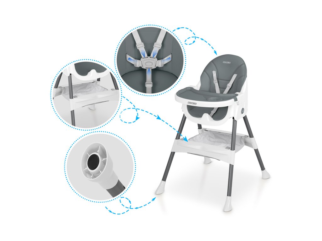 Stolica omogućuje slobodno podešavanje udaljenosti ladice od djeteta. Može se također u potpunosti ukloniti u bilo kojem trenutku.