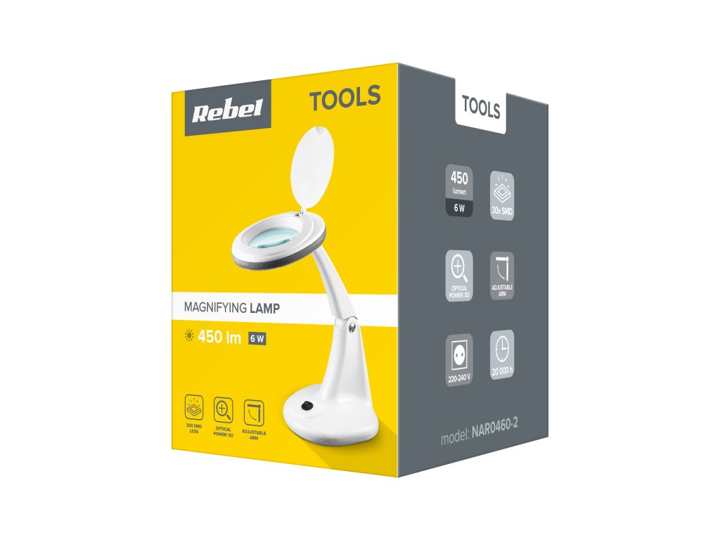 Zahvaljujući čvrstoj bazi, uređaj možete stabilno postaviti na stol ili površinu stola te pomoću ruke prilagoditi kut gledanja svojim potrebama. LED lampa s 5 dioptrijskim povećalom osigurava vrlo dobro povećanje pregledavanih predmeta. Za pravilnu brigu o povećalu, lampa Rebel dodatno je opremljena poklopcem koji prekriva leću kako bi se spriječilo nakupljanje prašine.