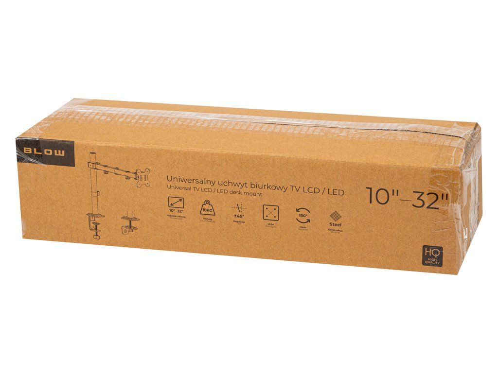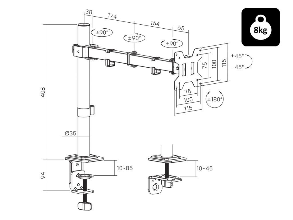 Držač je prilagođen za instalaciju na monitore s najpopularnijim VESA standardom s razmakom 75x75mm i 100x100mm. Maksimalna težina montiranih ekrana ne smije prelaziti 8 kg, držač je namijenjen za 10" - 32" monitore.