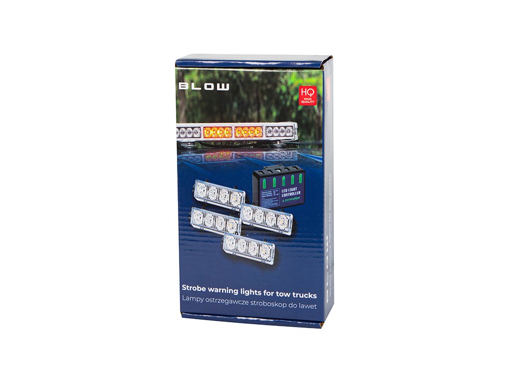 Profesionalni komplet LED stroboskopa 12V. Komplet svijetli narančastom svjetlošću, dostupno je nekoliko svjetlosnih programa pomoću kontrolera, stroboskopi su vodootporni. Snaga kompleta je do 16W.