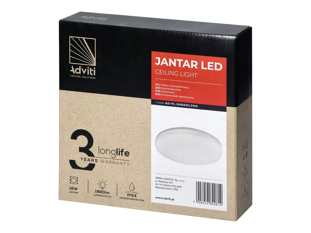 JANTAR LED 18W je zidna i stropna svjetiljka koja se odlikuje ne samo visokom funkcionalnošću i otpornošću, već i estetskim izgledom.Uređaj ima 18W LED diode koje generiraju jasan i ravnomjeran svjetlosni tok od 1880 lm. Ova svjetlina je optimalna kako za uporabu u kućnim interijerima, tako i u raznim javnim prostorima kao što su uredi, hoteli, škole ili trgovine. Boja temperature plafona je 4000K, što znači neutralno bijelu boju svjetla.