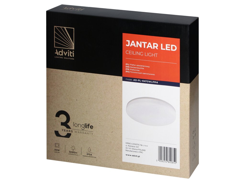 JANTAR LED 30W je zidna i stropna svjetiljka koja se odlikuje ne samo visokom funkcionalnošću i otpornošću, već i estetskim izgledom.Uređaj ima LED diode od 30W koje generiraju jasan i jednolik svjetlosni tok od 3225 lm. Ova svjetlost je optimalna kako za upotrebu u kućnim interijerima, tako i u raznim javnim prostorima poput ureda, hotela, škola ili trgovina.