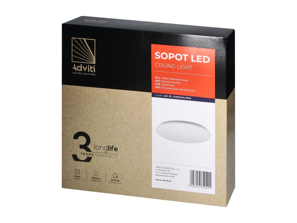 Funkcionalan i koherentan raspored moguće je stvoriti odabirom svjetiljki iz nekoliko dostupnih serija, od kojih svaka ima specifičnu snagu i karakteristike.SOPOT, je 18W LED stropna svjetiljka s neutralnom bojom svjetla (4000K) i svjetlosnim tokom od 1880lm.Svjetiljka je prikladna i za samostalnu montažu.