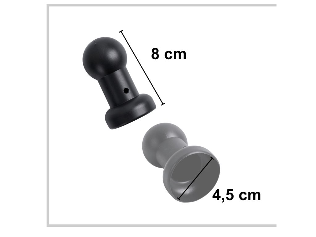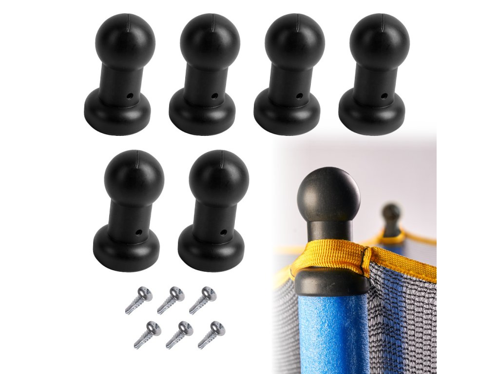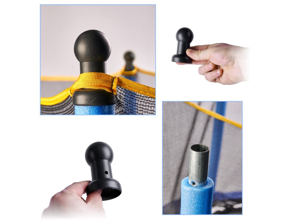 Set plastičnih gljiva Za pričvršćivanje mreže na trampolinu. Kompatibilne su s oba modela trampolina, koji imaju vanjsku mrežu i unutarnju mrežu. Otvor u gljivama ima promjer 2,5 cm. Da biste ih montirali, jednostavno ih pričvrstite na stupove pomoću vijaka.