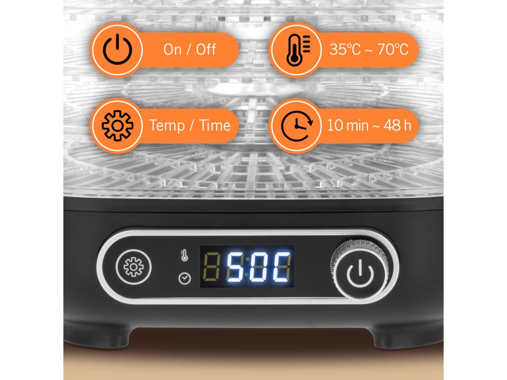 U širokom rasponu temperature (35–70°C) možete savršeno prilagoditi postavke vrsti suhog proizvoda – nježne biljke, mesnato voće ili aromatično povrće. To osigurava optimalno sušenje bez rizika gubitka vrijednih hranjivih tvari.