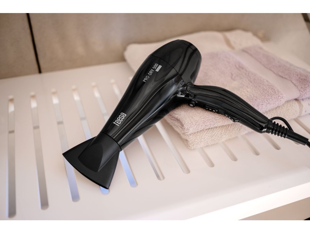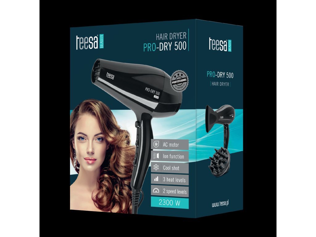 Sušilo za kosu Teesa PRO-DRY s izmjeničnim motorom snage do 2 300 W osigurava brzo i učinkovito sušenje čak i najtvrdokornije kose. Zahvaljujući funkciji ionizacije kosa se neelektrizira, glađa je i izgleda zdravije. 3 stupnja temperature i 2 brzine strujanja zraka pružaju vam veću kontrolu i štite vašu kosu tijekom sušenja. Pušenje hladnog zraka dodatno olakšava završetak frizure i daje joj konačni oblik. U pakiranju se nalazi difuzor koji raspršuje zrak u kosi i dodaje joj volumen i valovitost. Koncentrator za puhanje s druge strane omogućuje precizno usmjeravanje zraka na željene pramenove kose.