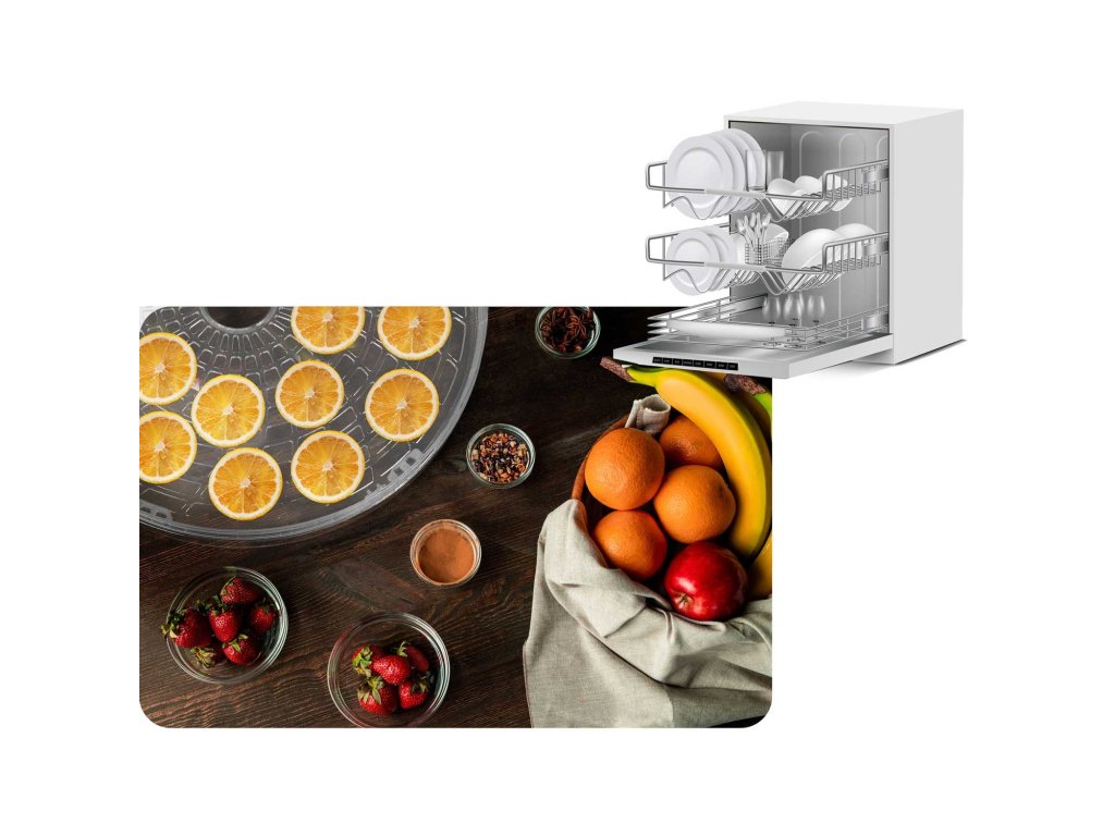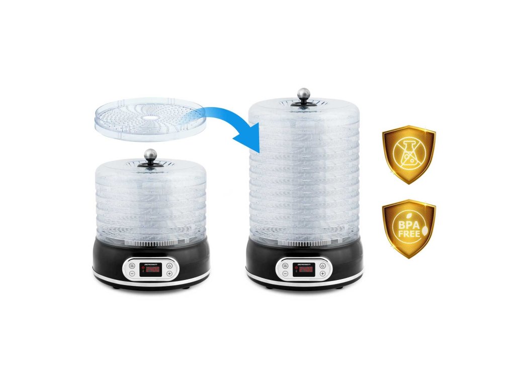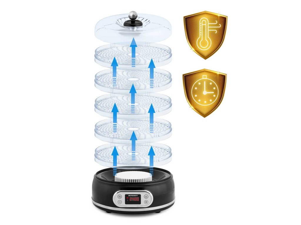 Sušilica se sastoji od 5 spremnika s finim mrežama, koje sprečavaju ispadanje i najmanjih proizvoda.