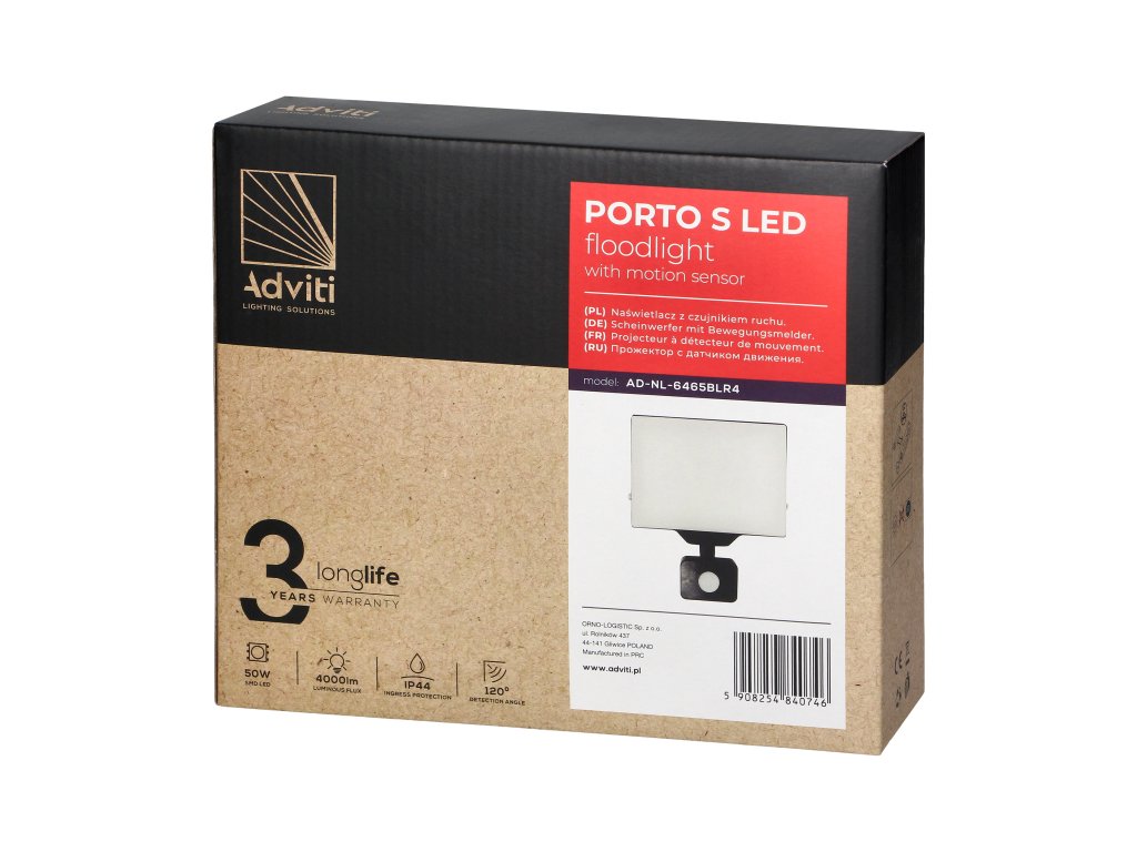 Bezrubni LED reflektor PORTO S s senzorom pokreta je proizvod od 50W sa svjetlosnim tokom od 4000lm.Zahvaljujući tome, nudi snažno i jasno svjetlo, idealno za upotrebu na mnogim mjestima, uključujući vanjski prostor.Uređaj je izrađen od nelomljivog aluminija i plastičnog difuzora.Poboljšana razina zaštite IP44 znači da je reflektor zaštićen od prašine i vode, što ga čini idealnim za vanjsku upotrebu.
