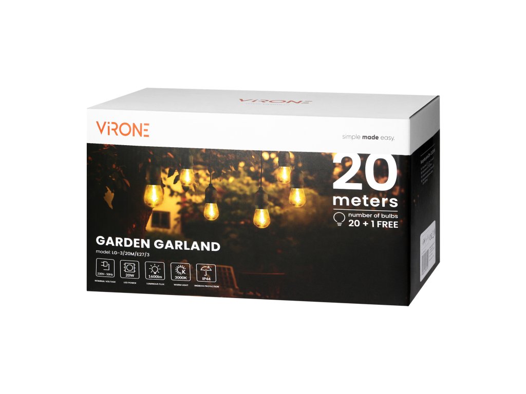 20 m duga svjetlosna girlanda savršena je vanjska dekorativna rasvjeta, posebno korisna na mjestima gdje nije dostupan tradicionalni izvor energije. Prikladna je za upotrebu u vrtovima, na terasama ili balkonima kao dekoracija tijekom ljetnih večeri ili drugih vanjskih prilika.Girlanda sadrži 20 svjetlosnih točaka koje su ravnomjerno raspoređene svakih 1 m. To osigurava vrlo dobru disperziju svjetla duž cijele dužine girlande. Set uključuje 20 LED žarulja s snagom od jednog vata i svjetlosnim tokom od 80 lm svaka. U kompletu je i jedna rezervna žarulja. Sve žarulje emitiraju ugodnu i toplu svjetlost s temperaturom od 3000 K. Kut svjetlosnog snopa (270°) široko raspršuje svjetlost, pokrivajući veliku površinu. Rasvjeta je dakle ne samo funkcionalna, već i opuštajuća, dajući okolini jedinstveni karakter.