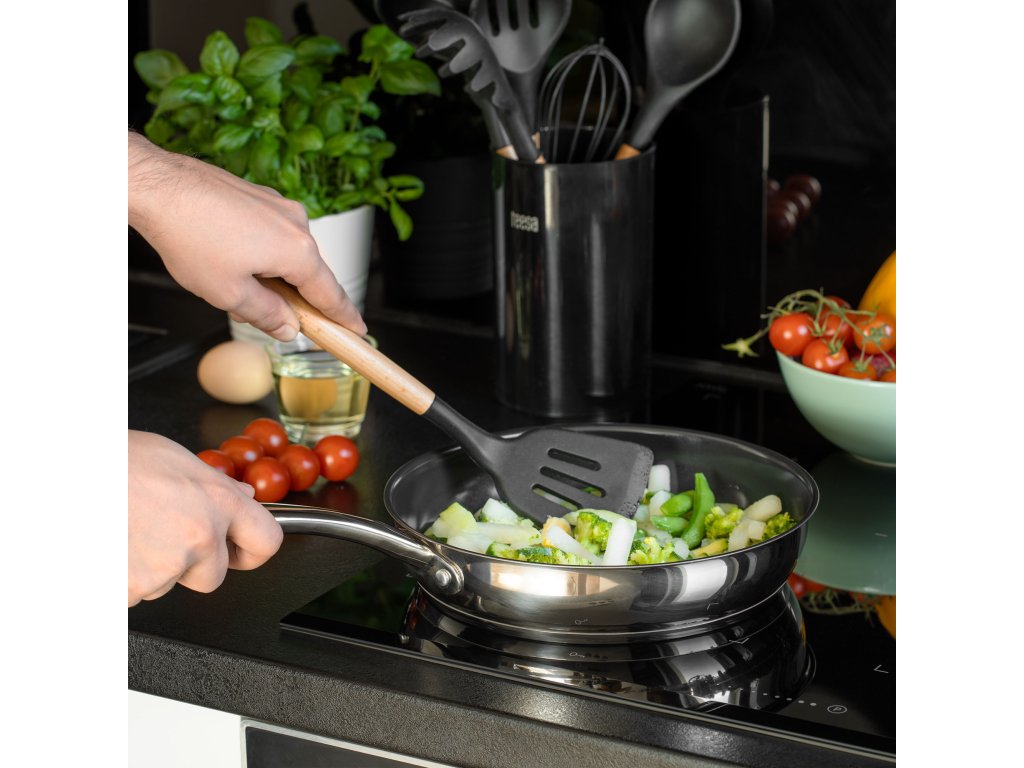 Sigurnost Teesa tave osigurava ergonomski dizajnirana nitovana ručka, koja se ne zagrijava. Udobnom korištenju pridonosi neljepljiva keramička površina, kao i debelo višeslojno dno koje osigurava ravnomjernu raspodjelu topline za učinkovito prženje. Zahvaljujući svom dizajnu, tava je prikladna za korištenje na svim vrstama štednjaka: plinskim, električnim, staklokeramičkim i indukcijskim.