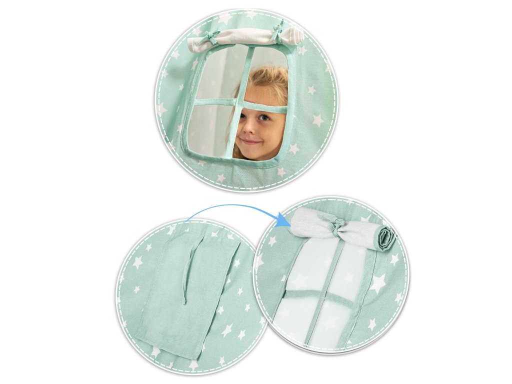 Šator se u sklopljenom stanju lako prenosi . Može biti postavljen u dnevnoj sobi kao igralište ili u vrtu kao zaštita od jakog sunca.