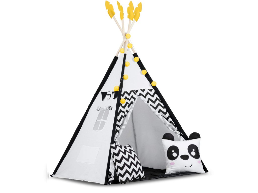 Teepee šator za djecu s girlandom i svjetlima Nukido bijela crna s pandom