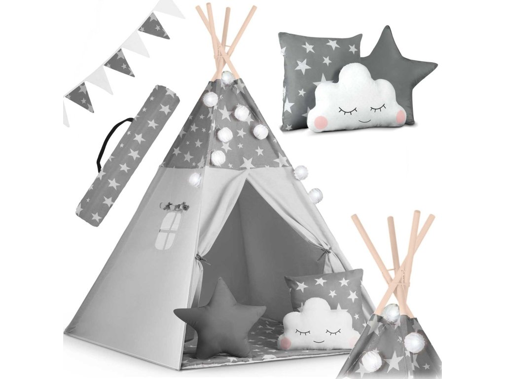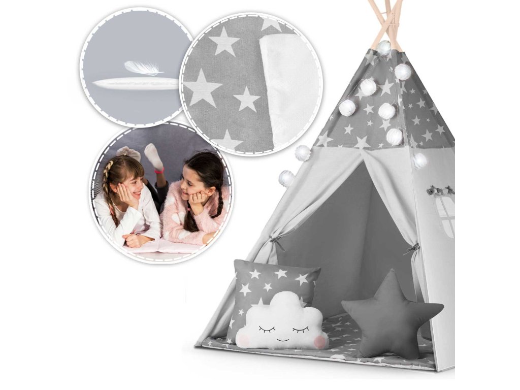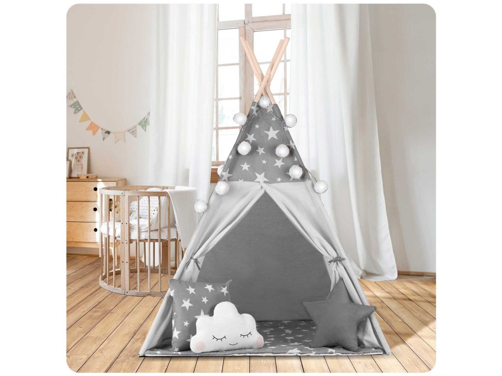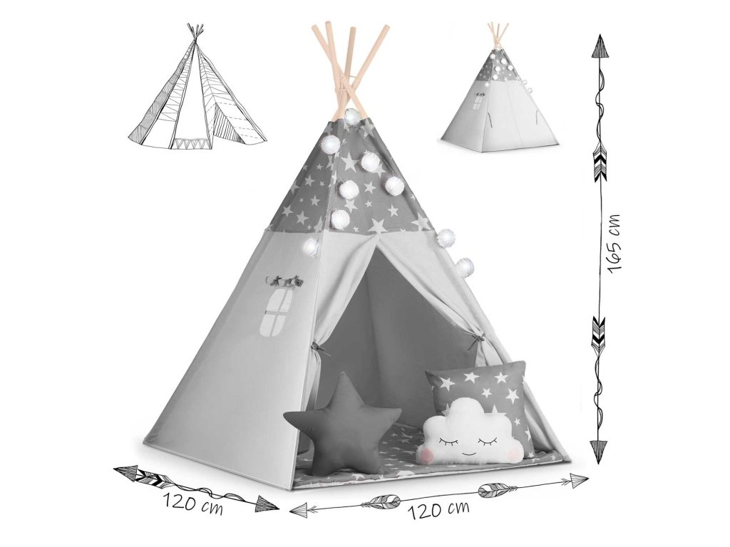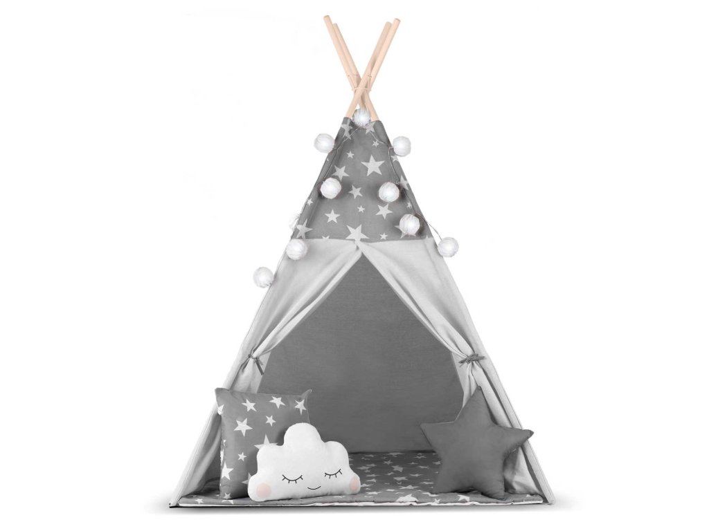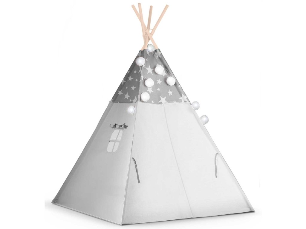 Teepee šator za djecu s girlandom i svjetlima Nukido - sivi s zvjezdicama