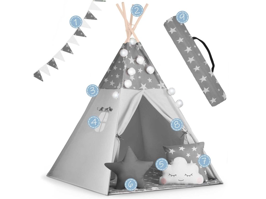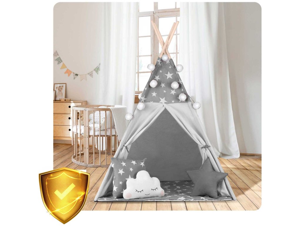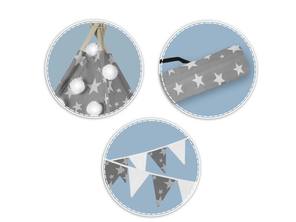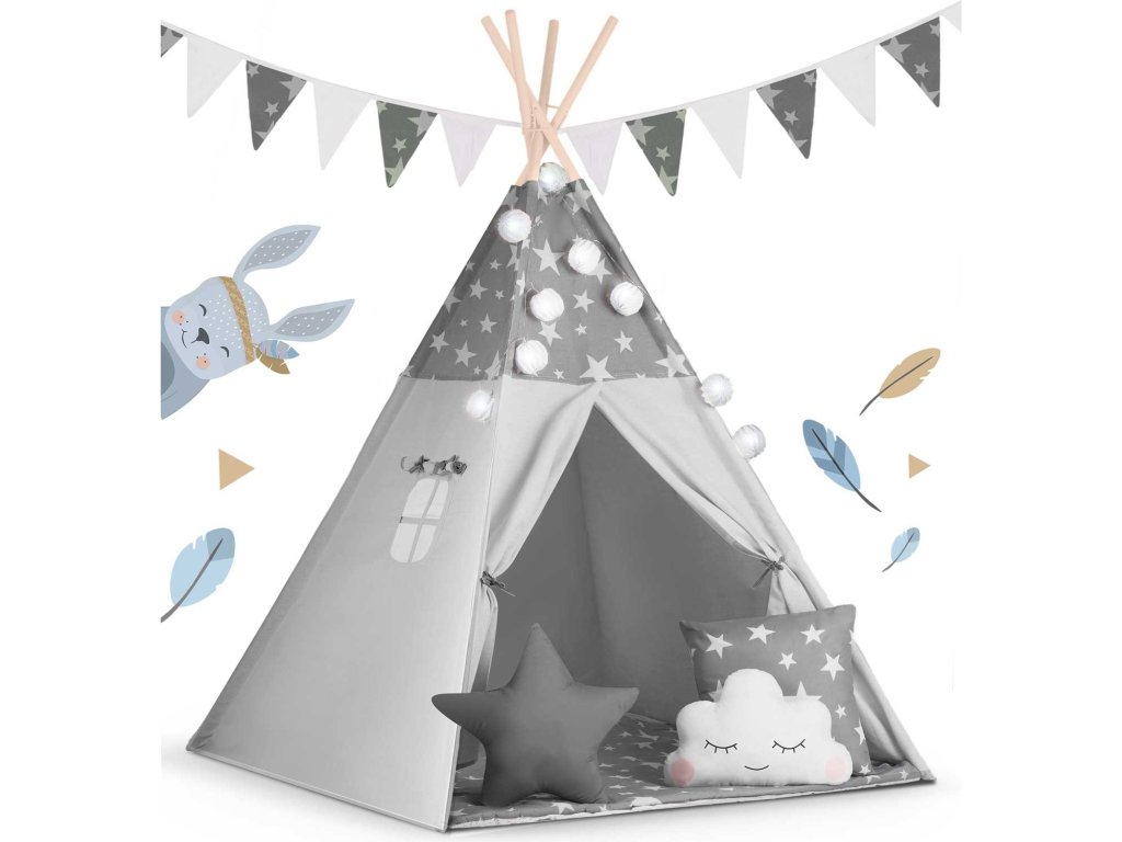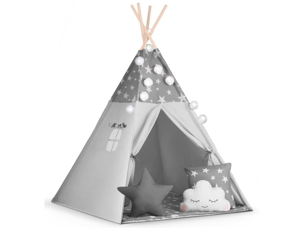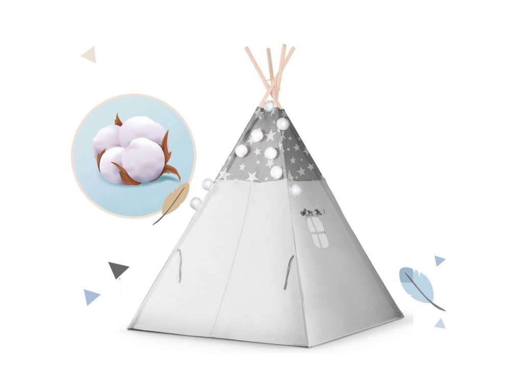 Teepee šator za djecu s girlandom i svjetlima Nukido - sivi s zvjezdicama
