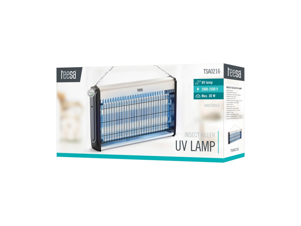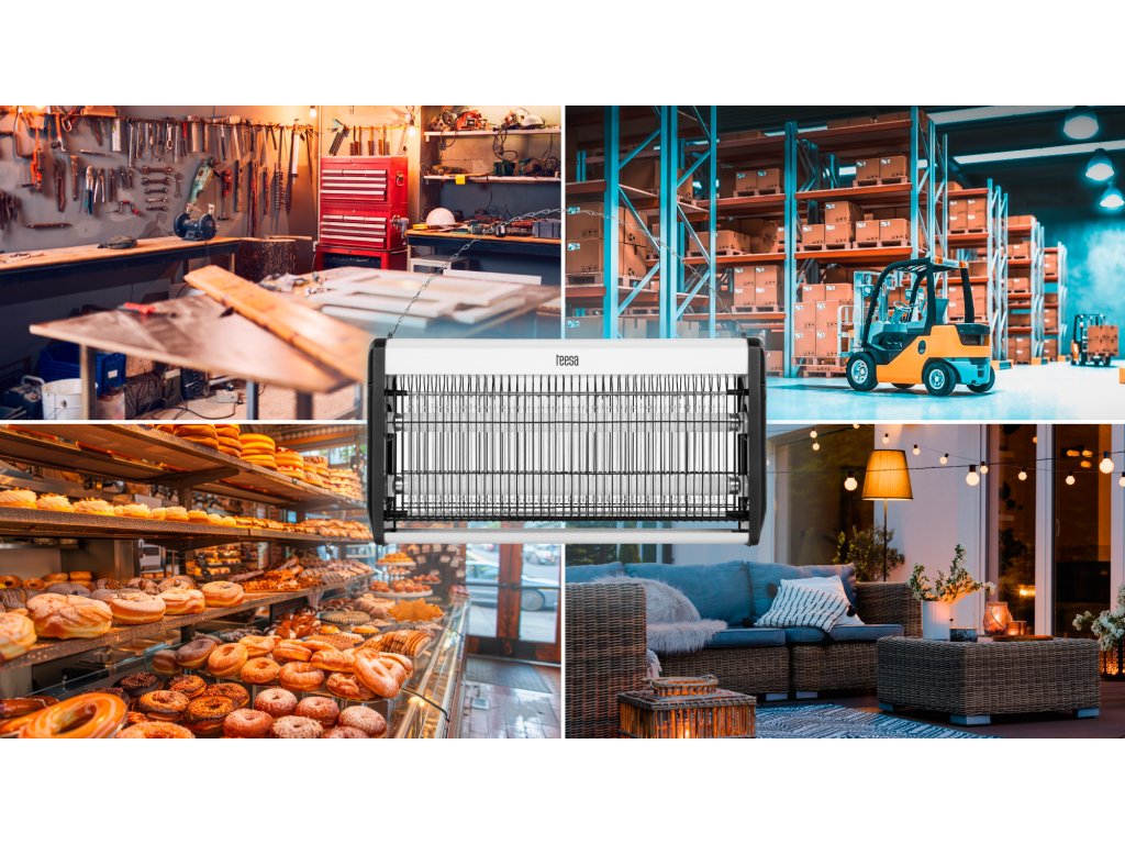 Dosta su vam muhe, komarci i drugi dosadni insekti Isprobajte UV lampu za insekte Teesa. Ovaj model je dizajniran s obzirom na maksimalnu učinkovitost i namijenjen je za prostorije velike površine – do 100 m2, pa je idealan za skladišta, trgovine i radionice.