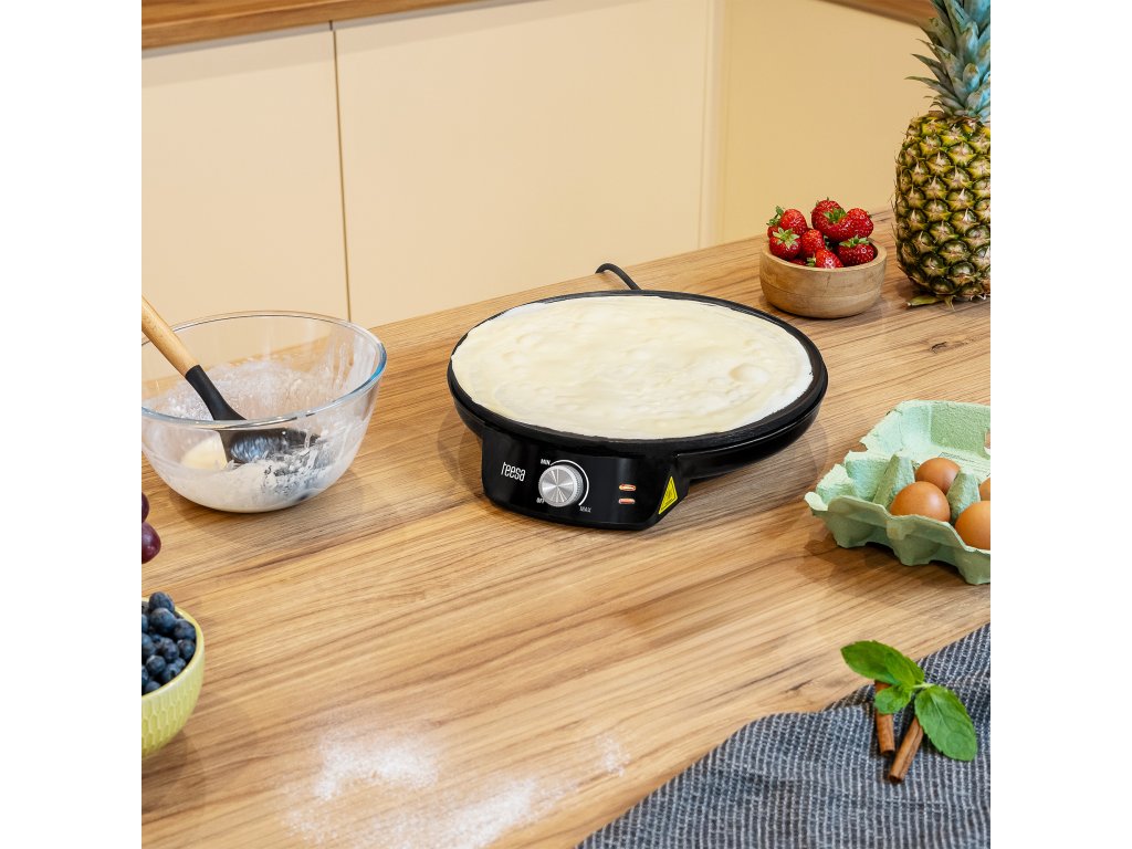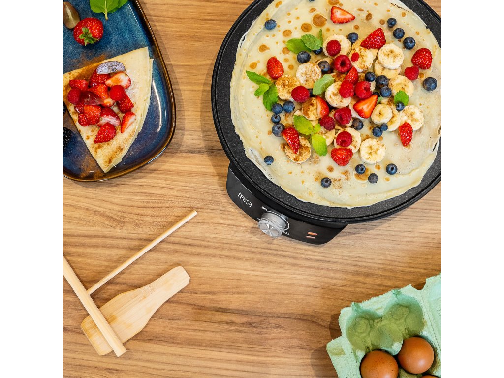 Aparat za palačinke Teesa uključuje i pribor potreban za savršenu pripremu palačinki. Set uključuje, između ostalog: uređaj za ravnomjerno razmazivanje tijesta, kako bi palačinke imale savršen oblik i debljinu, te lopaticu koja olakšava okretanje palačinki tijekom prženja. ----------