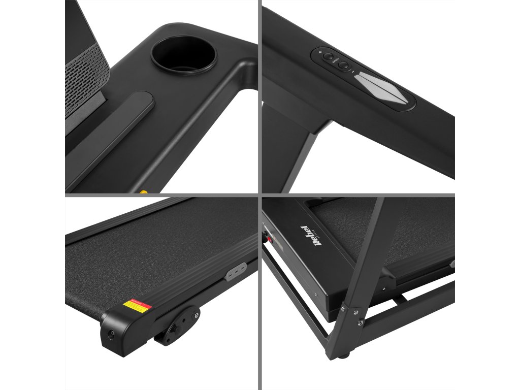 Kućna traka za trčanje Rebel Active ima praktične police za boce s vodom ili izotoničnim napitcima. Zahvaljujući njima, lako možete održavati pravilnu hidrataciju tijekom treninga bez potrebe da prestanete trčati.