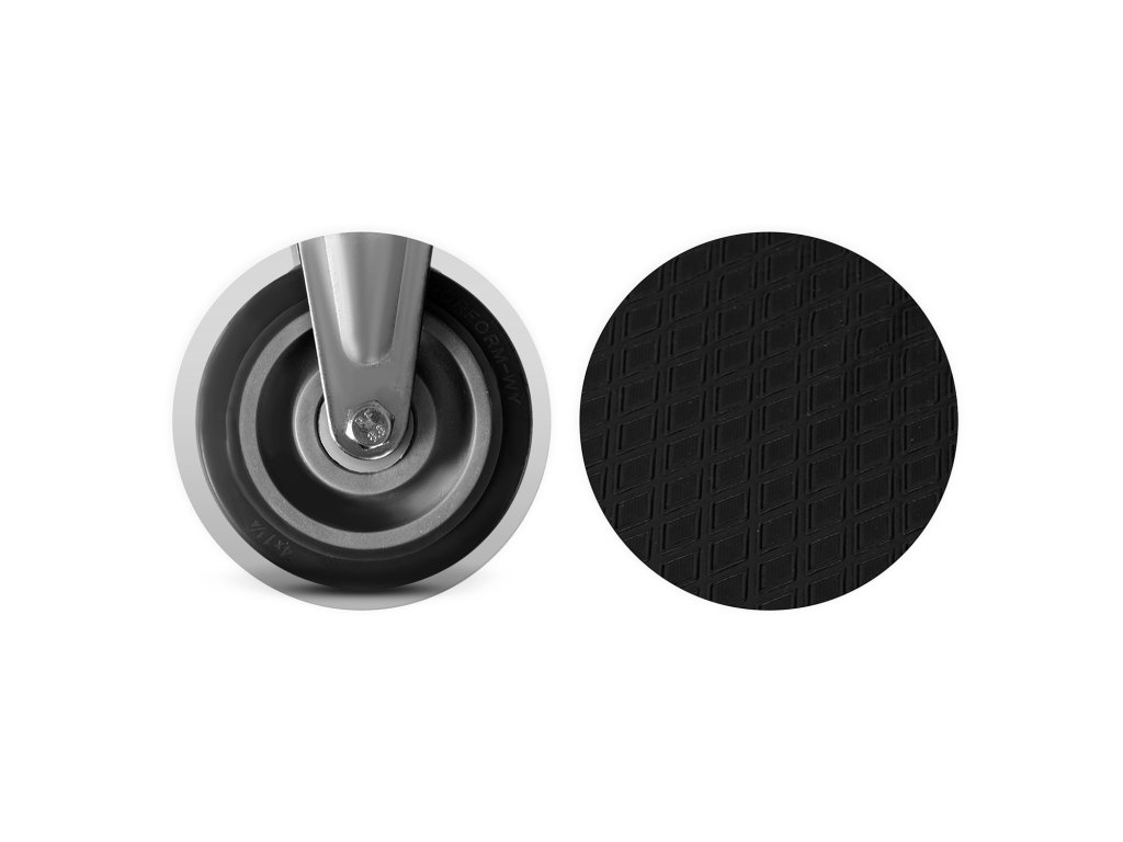 - Kolica imaju 2 potpuno okretna gumena kotača s metalnim ojačanjem, što omogućava glatko i precizno manevriranje.