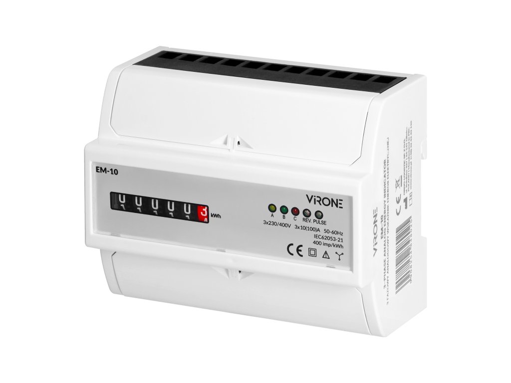 3-fazni analogni pokazivač energije je precizan mjerni uređaj za praćenje i bilježenje aktivne potrošnje energije u trofaznim krugovima. Mjerač je dizajniran za nazivni napon 3x230V do najviše 400V i nazivnu struju do 3x100A. Niska osnovna struja od 20W ili 100VA doprinosi energetskoj učinkovitosti instalacije.Potrošnja energije tijekom faze indikacija je trepćućom LED-icom. Broj impulsa pretvara se u potrošenu energiju i njegova vrijednost prikazana je brojem 5+1. Osim toga, pokazivač je opremljen električnim impulsnim izlazom tipa S0, koji generira 400 imp/kWh.