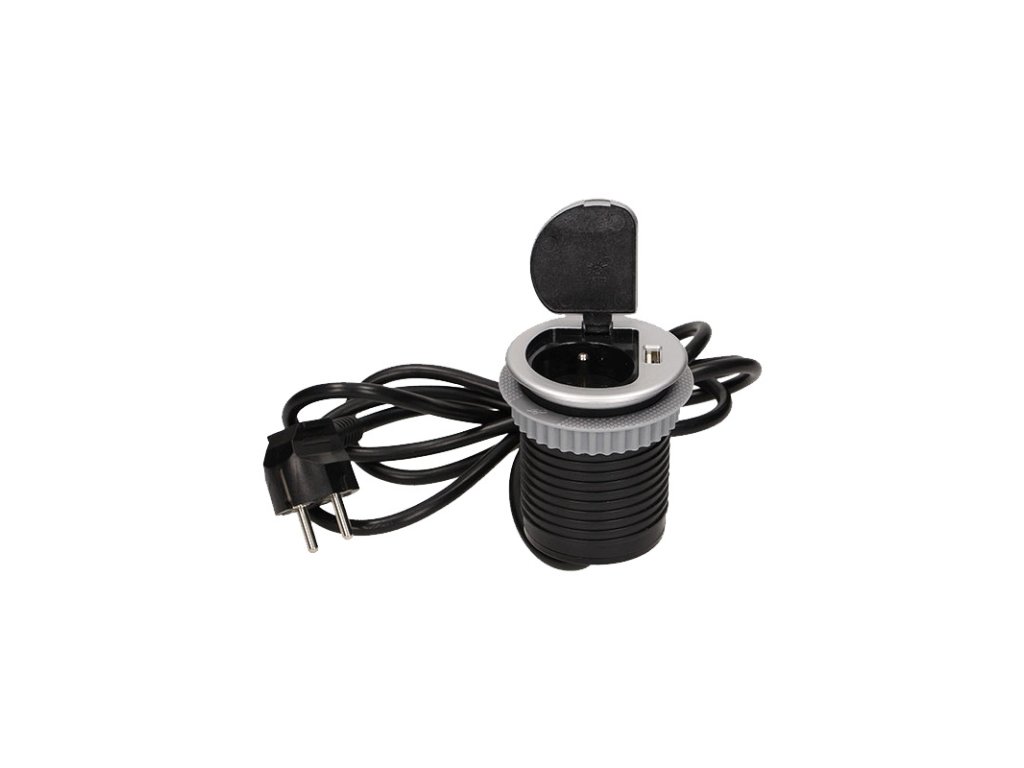 Utičnica 2P+Z s ugrađenim USB punjačem i dodatnim poklopcem za zaštitu utičnice. Namijenjena za unutarnju ugradnju u stolove, radne ploče i stolove koji omogućavaju pristup električnim utičnicama. Za ugradnju uređaja u radnu ploču dovoljan je jedan otvor promjera 6 cm.Tehnička specifikacija:
