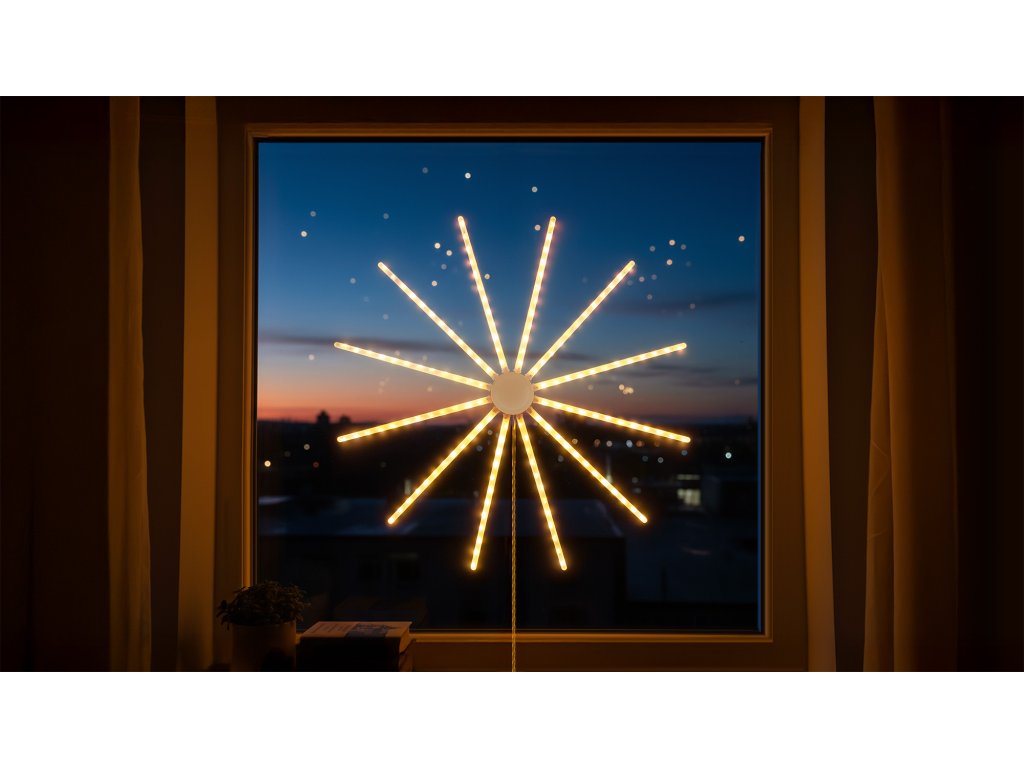 Božićna zvijezda Rebel oduševljava gustim, ujednačenim svjetlom zahvaljujući 132 štedljive LED diode raspoređene na 12 nježnih žica. One stvaraju efektne odsjaje i suptilne bljeskove, koji se lijepo predstavljaju kako tijekom dana, tako i u sumrak. Idealna kao središnja točka blagdanske dekoracije interijera.