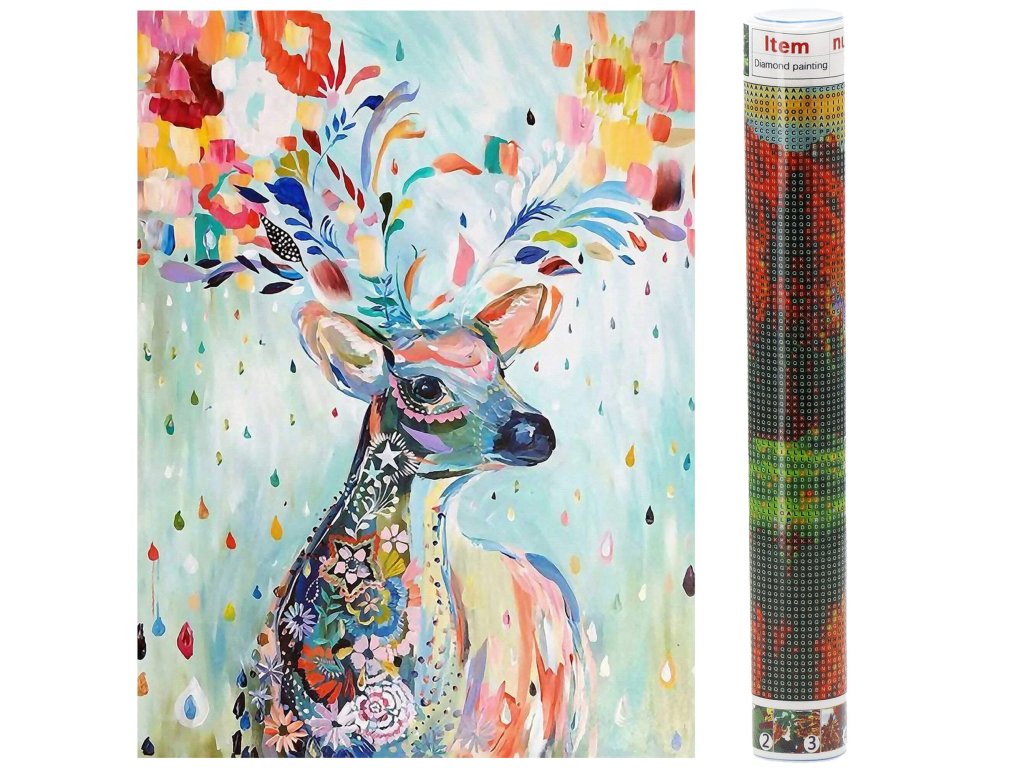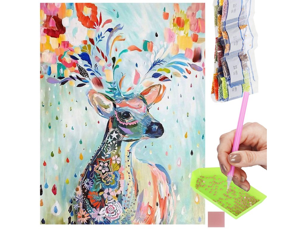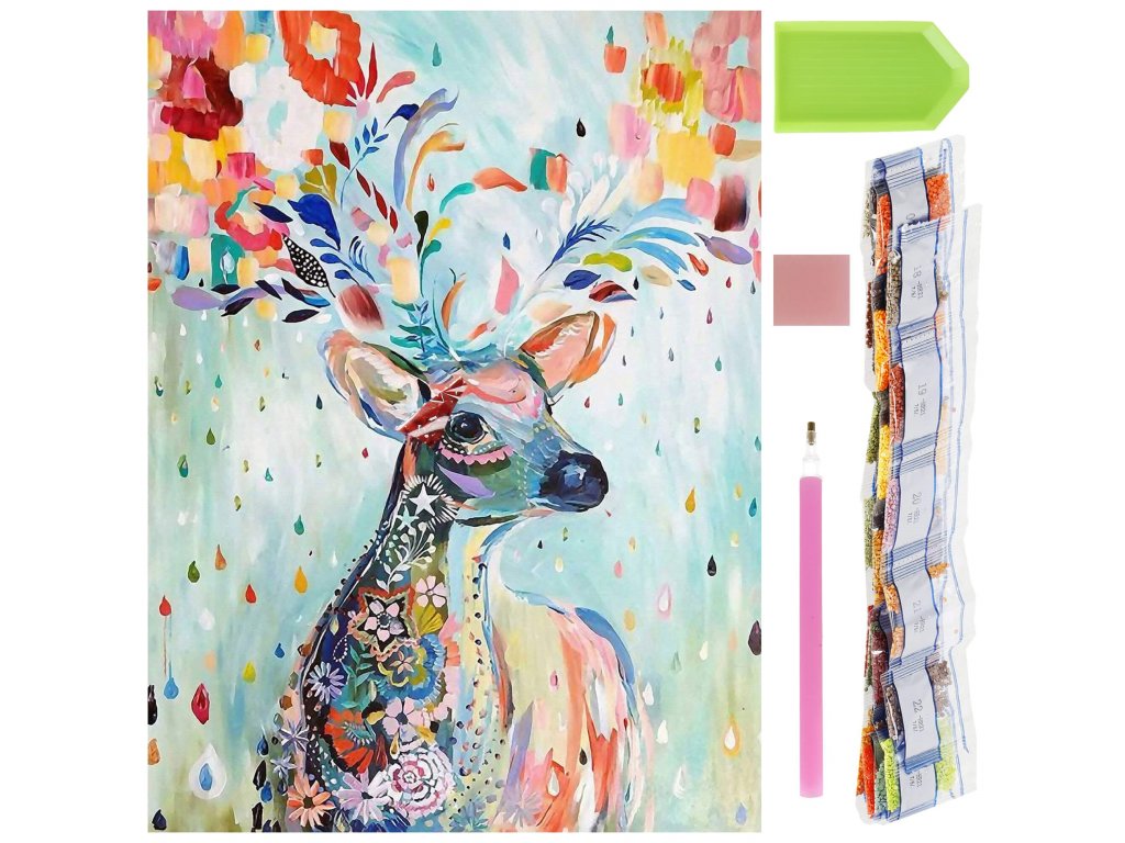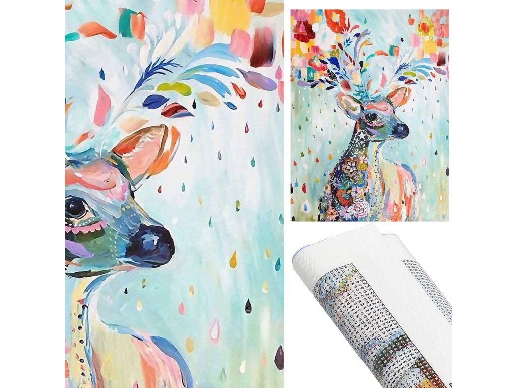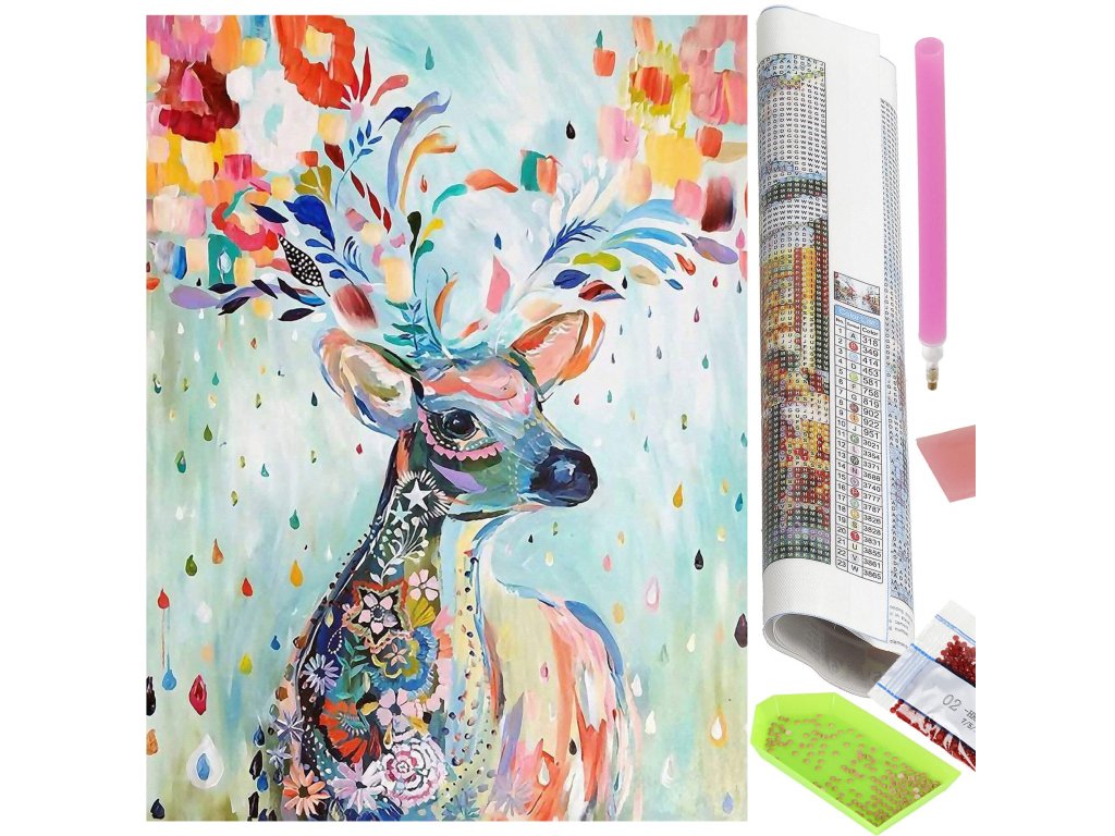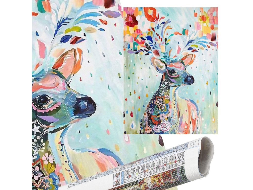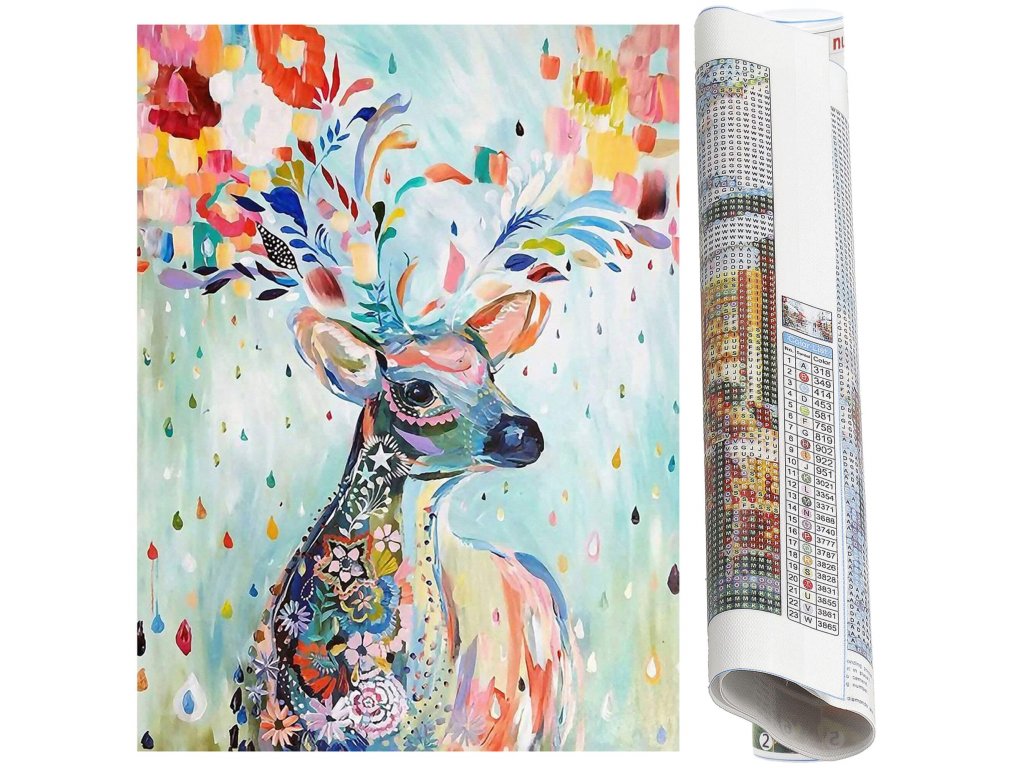 1x čvrsto platno s otisnutom slikom, prikazujući jelena i indeksom koji dodjeljuje slova bojama i boje brojevima koji određuju boju dijamanata
