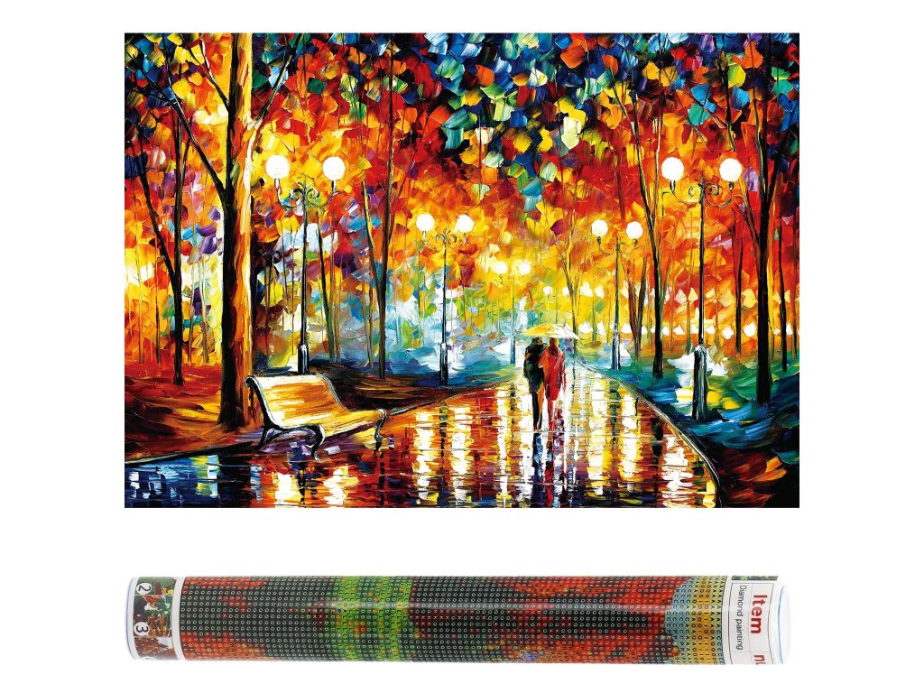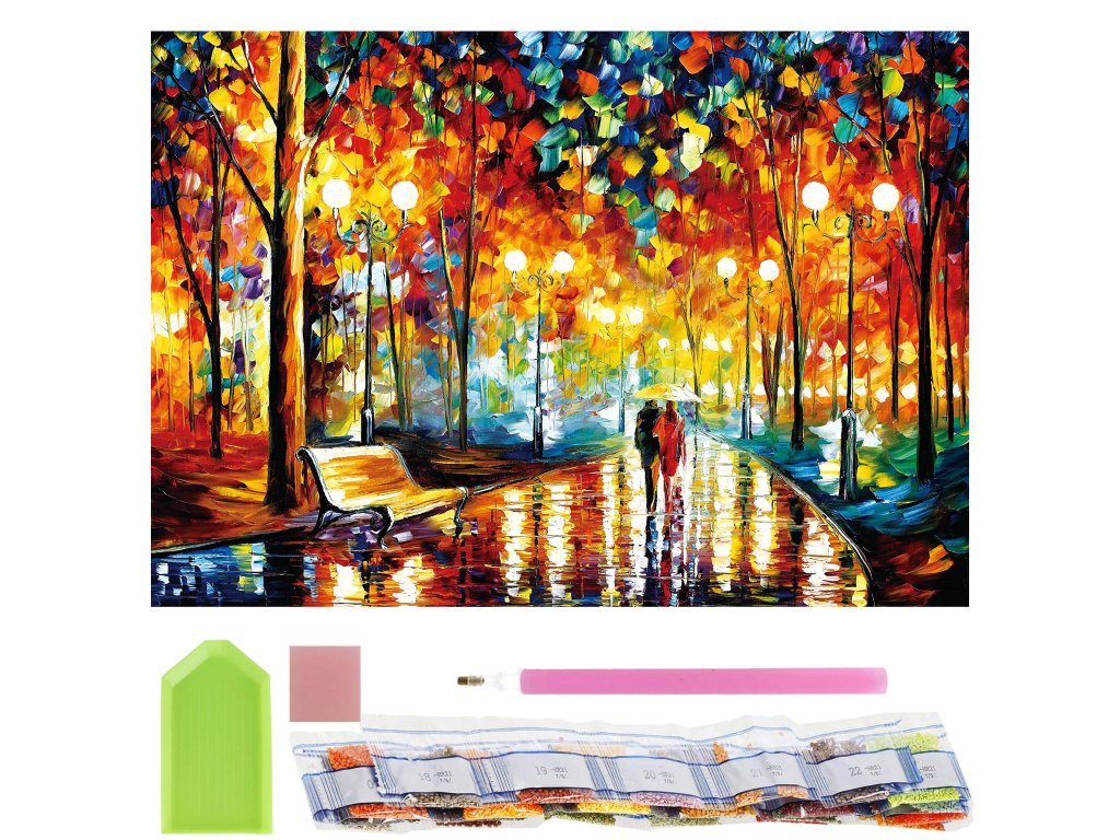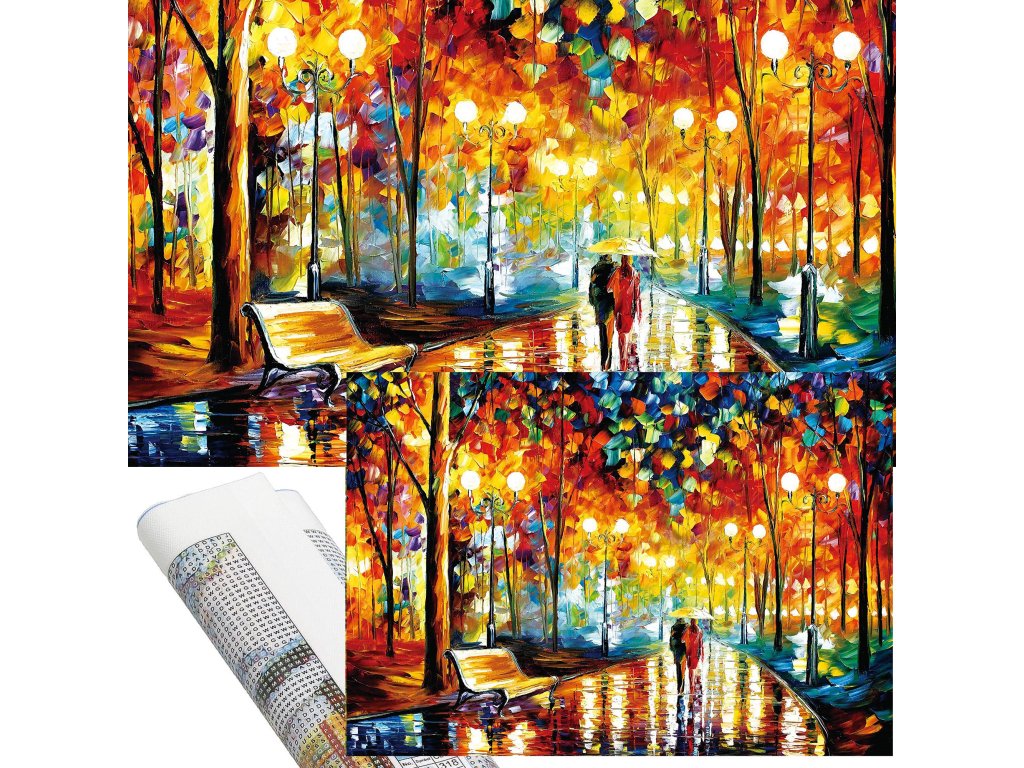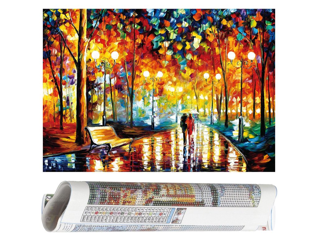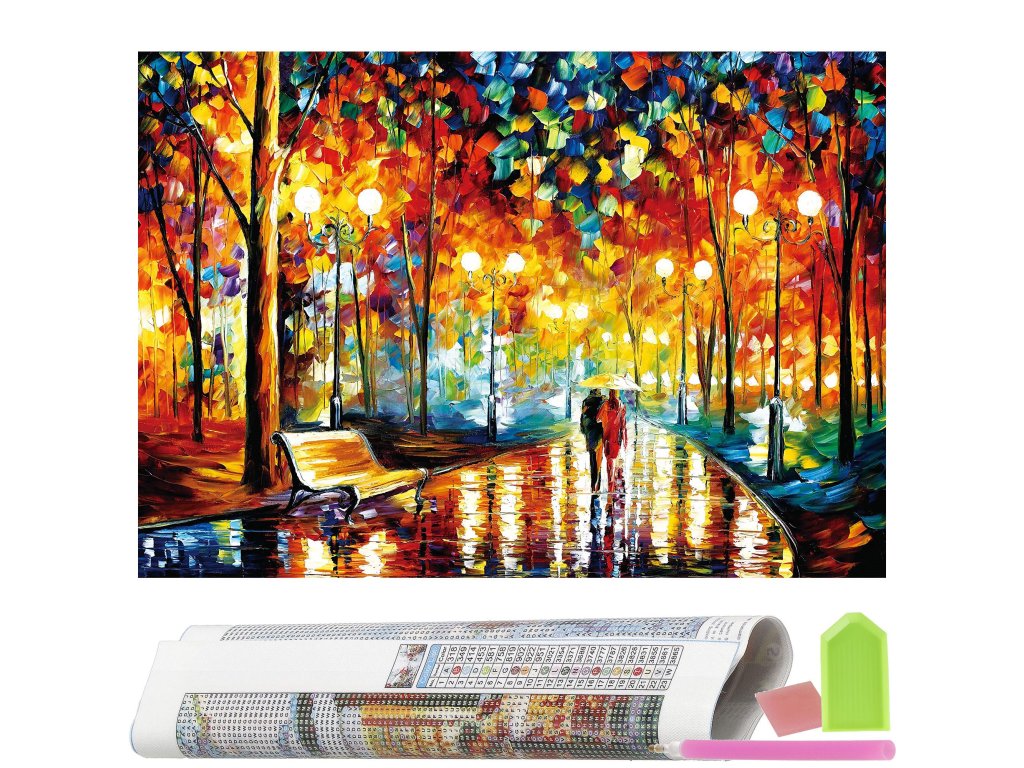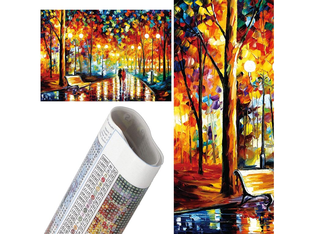 1x čvrsto platno s tiskanim slikom, prikazujući aleju u parku i indeksom koji dodjeljuje slova bojama i boje brojevima koji određuju boju dijamanta