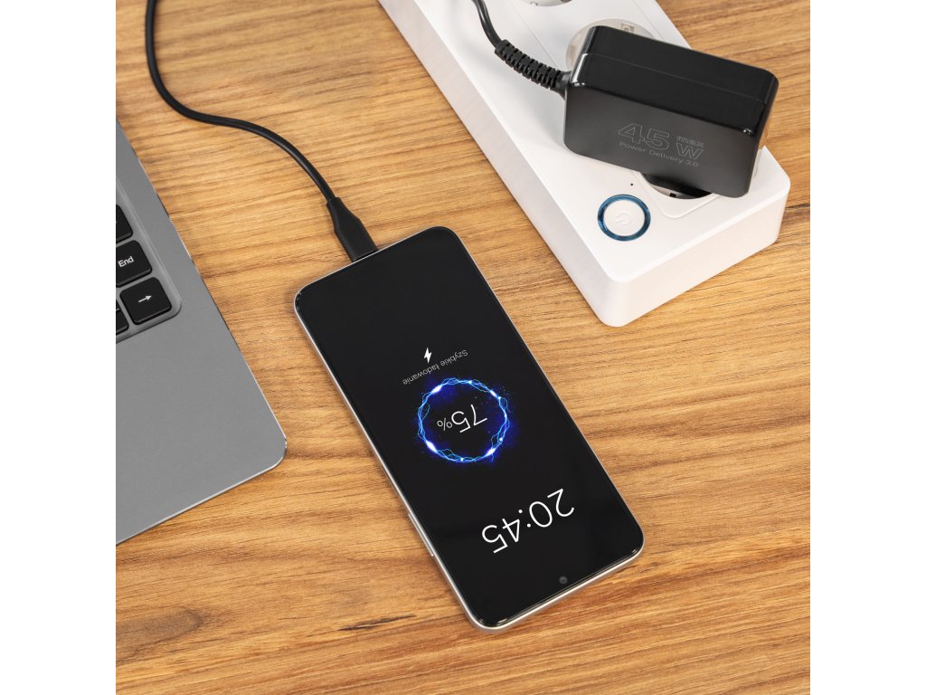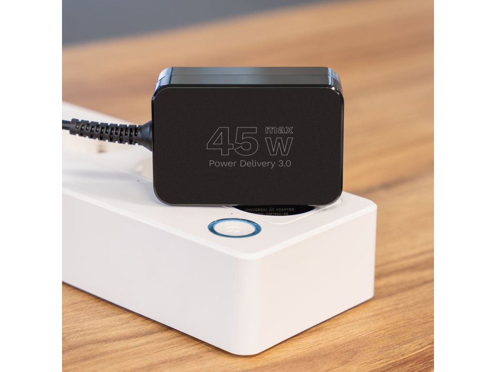 Ispravljač snage 45 W osigurava stabilno i brzo punjenje prijenosnih računala i mobilnih uređaja. Podržava tehnologiju Power Delivery 3.0, nudeći različite razine napona, čime automatski prilagođava parametre za povezanu opremu. To je praktično i energetski učinkovito rješenje za svakodnevnu uporabu.