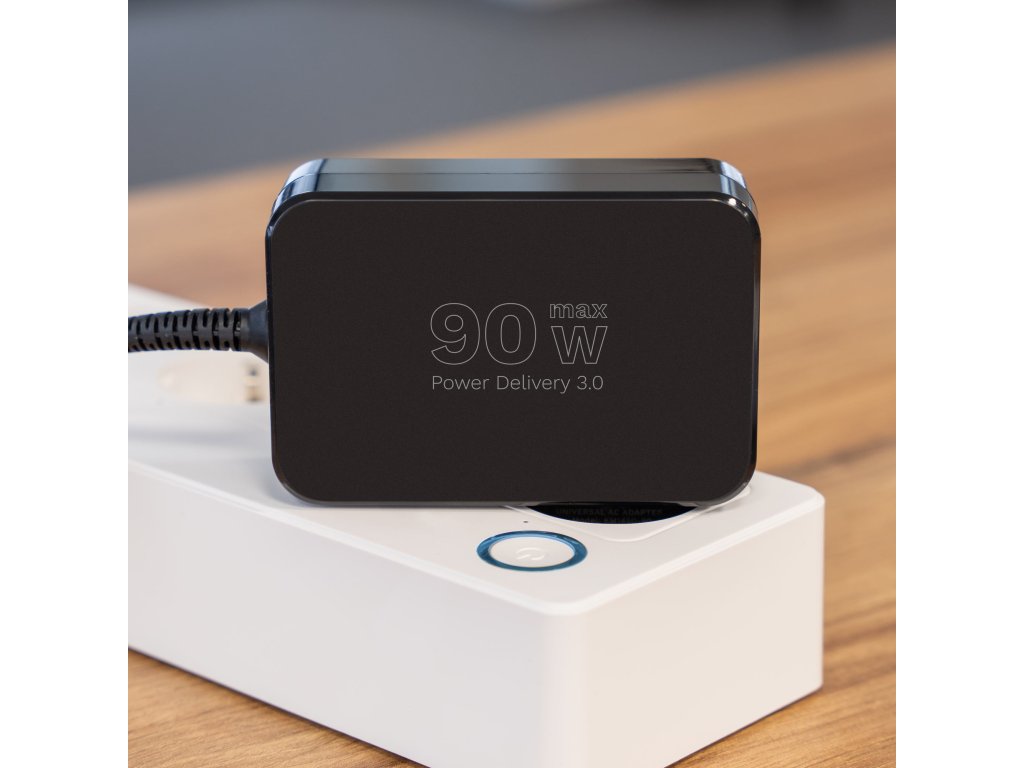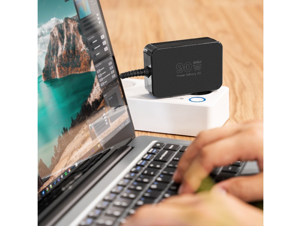 Veća snaga znači brže punjenje! Punjač od 90 W jamči učinkovito i stabilno napajanje laptopa i mobilnih uređaja. Podržava Power Delivery 3.0 s naponom od 5 V do 20 V, automatski prilagođavajući parametre uređaju. Zahvaljujući tome, čak i zahtjevni laptopi brzo će se napuniti.