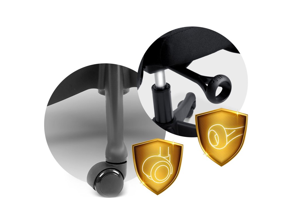 Čvrsta baza opremljena je najlonsko-gumenim kotačićima , koji se tiho kreću i ne grebu pod, a elegantan rotirajući podizač omogućuje zaključavanje kuta nagiba u tri položaja .