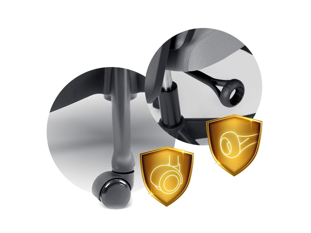 Čvrsta baza opremljena je najlonsko-gumenim kotačićima , koji se kreću tiho i ne grebu pod, a elegantni rotirajući podizač omogućuje zaključavanje kuta nagiba u tri položaja .